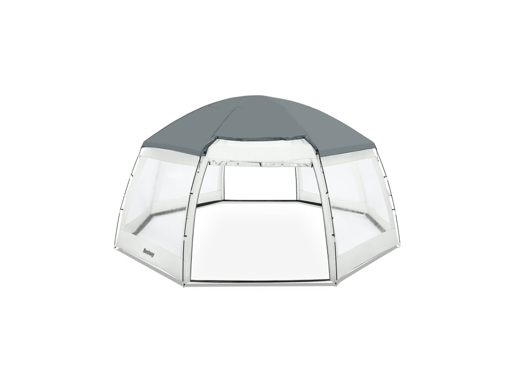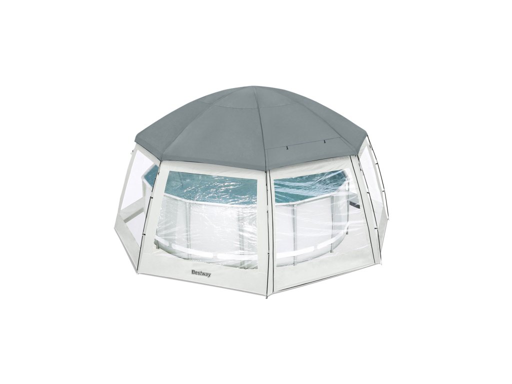Nagyobb kényelem a medence használatakor a dedikált Bestway sátorral - forró napokon árnyékot biztosít, a hálóknak köszönhetően védi a szúnyogoktól és más rovaroktól, esőben kényelmesen használható a medence vagy pezsgőfürdő, lassítja a víz hőveszteségét.