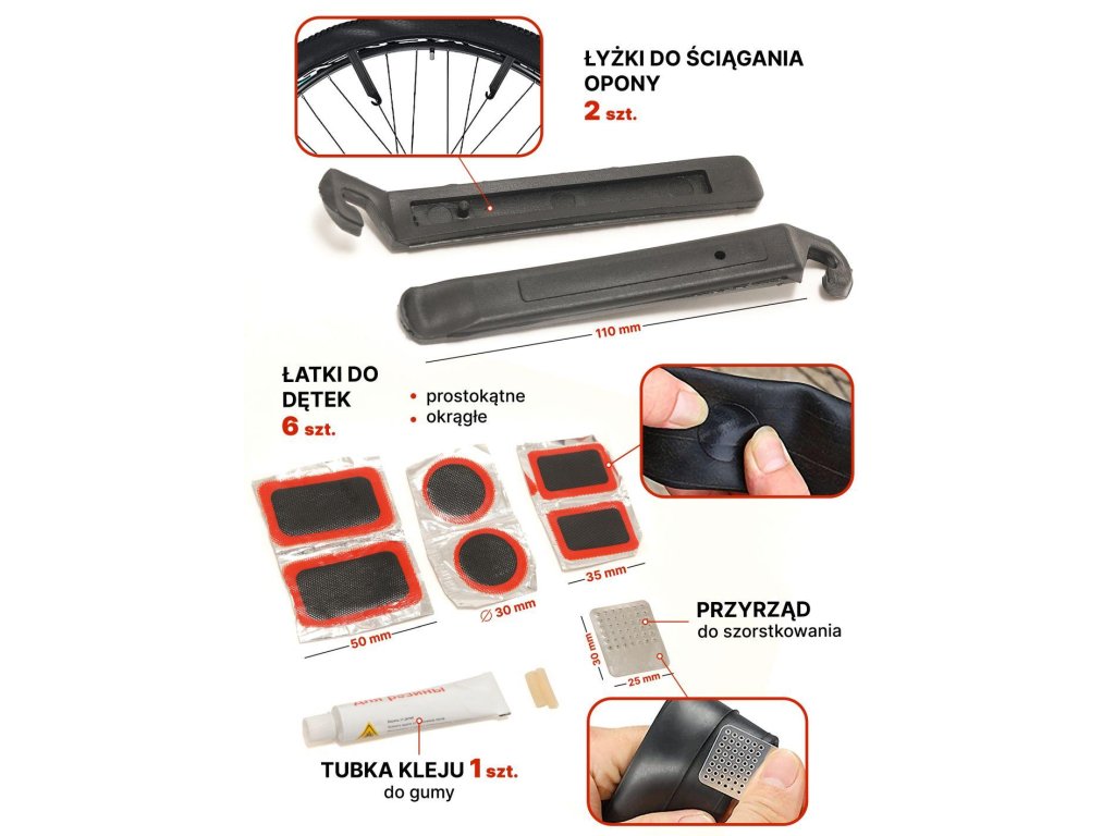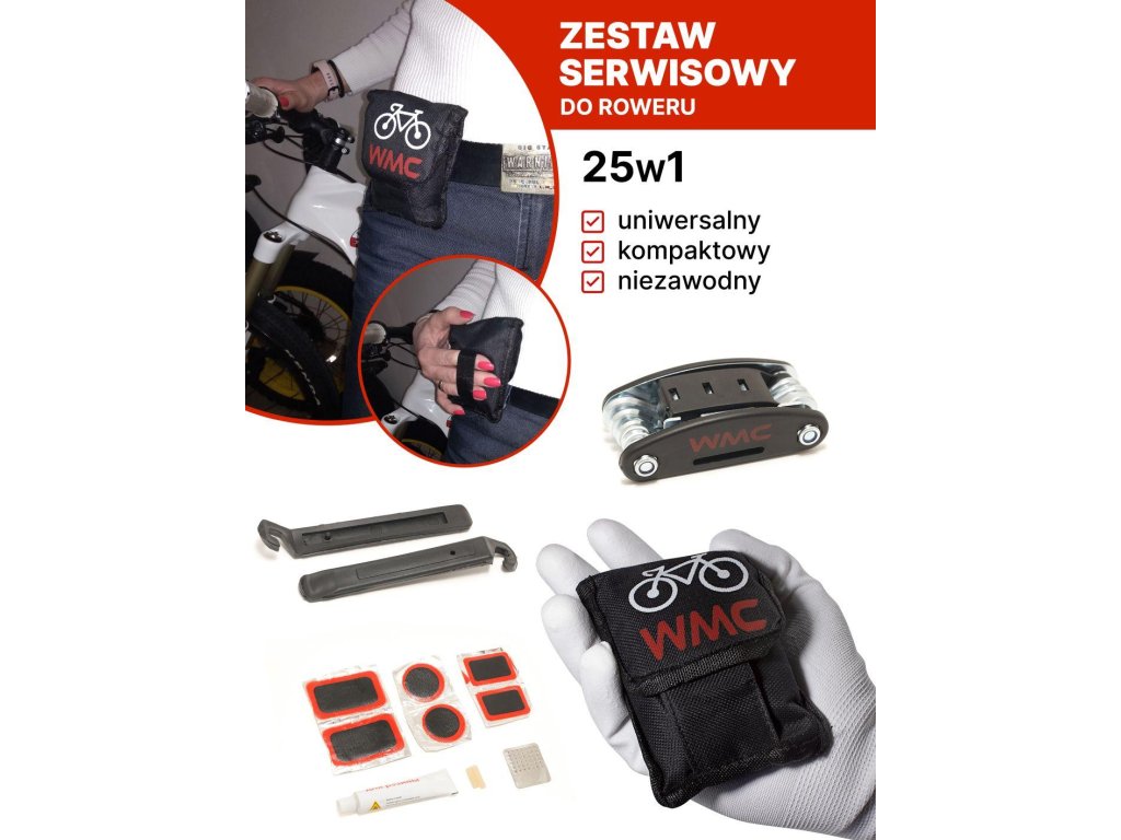 A készlet összesen 25 elemet tartalmaz, és emellett kicsi és tartós. A készlet belefér a hátizsákba, és nem fog sok helyet foglalni. Ezzel a kerékjavító készlettel lehet belső gumit foltozni, kereket cserélni, a vázat meghúzni vagy a váltót megjavítani.