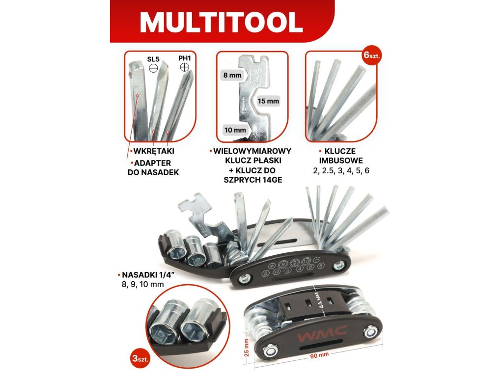 - 6 imbuszkulcs (méretek: 2, 2.5, 3, 4, 5, 6).