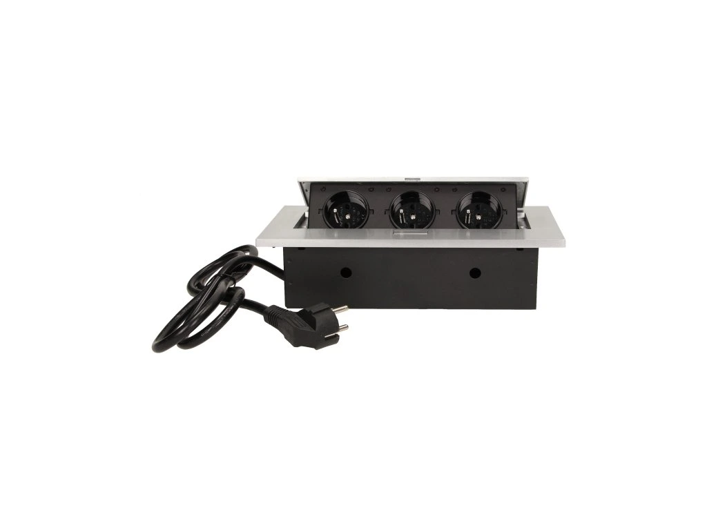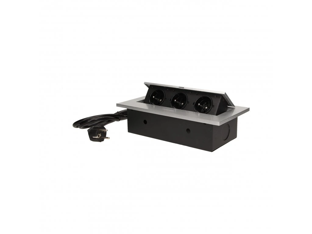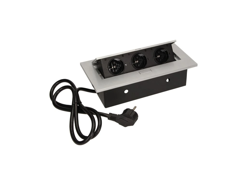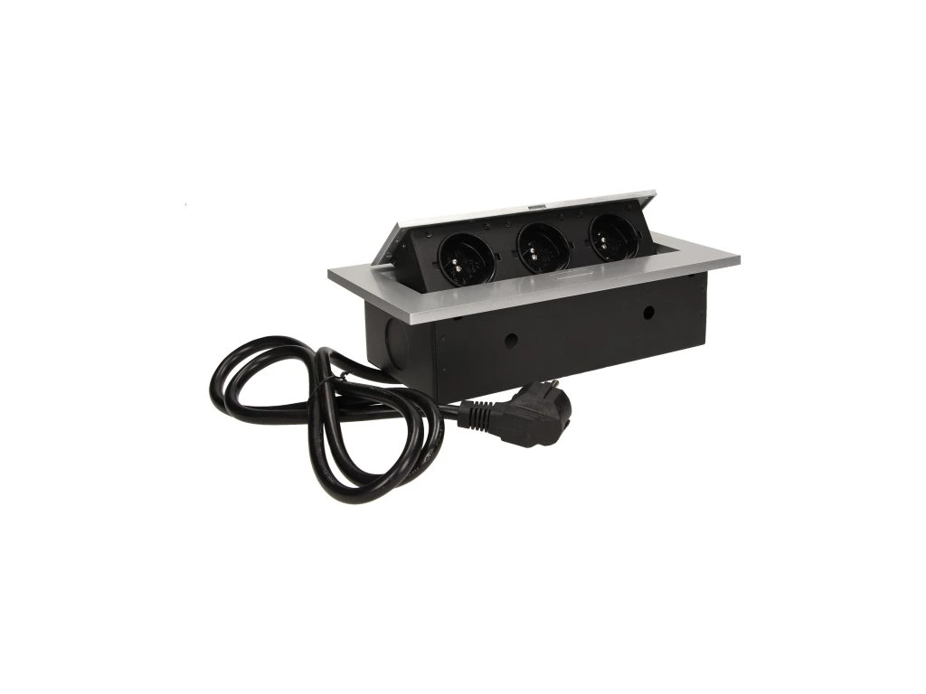 Három darab 2P+Z elektromos aljzatból álló készlet kihúzható felső fedélben. Asztalokba, asztallapokba és íróasztalokba történő belső beépítésre tervezve, függőleges és vízszintes helyzetben egyaránt, hozzáférést biztosítva az elektromos aljzatokhoz.Általános információk: