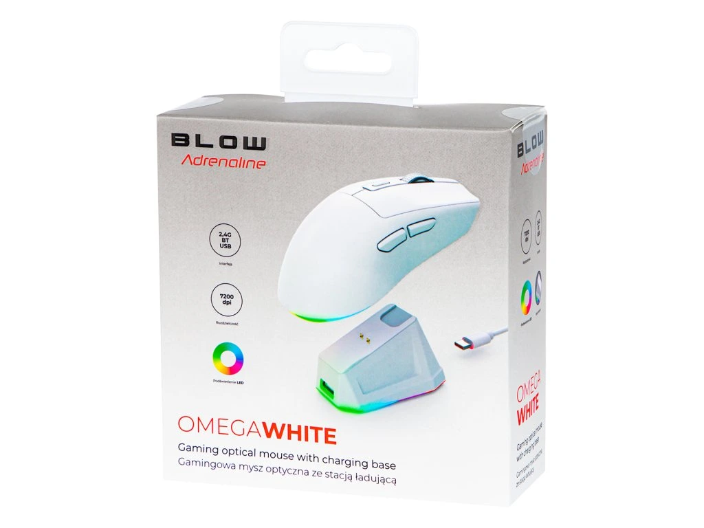 A BLOW Adrenaline OMEGA vezeték nélküli játékegér a modern dizájn és a magas funkcionalitás ötvözete. Precíziós, 7200 DPI felbontású érzékelővel, 6 programozható gombbal és RGB LED világítással van felszerelve, teljes kontrollt és kivételes vizuális hatást biztosítva. A 2,4G, Bluetooth és kábeles USB csatlakozást támogatva az igényeidhez igazíthatod a használati módot. A csomag tartalmaz egy töltőállomást USB hub funkcióval, ideális választásként igényes játékosok számára.