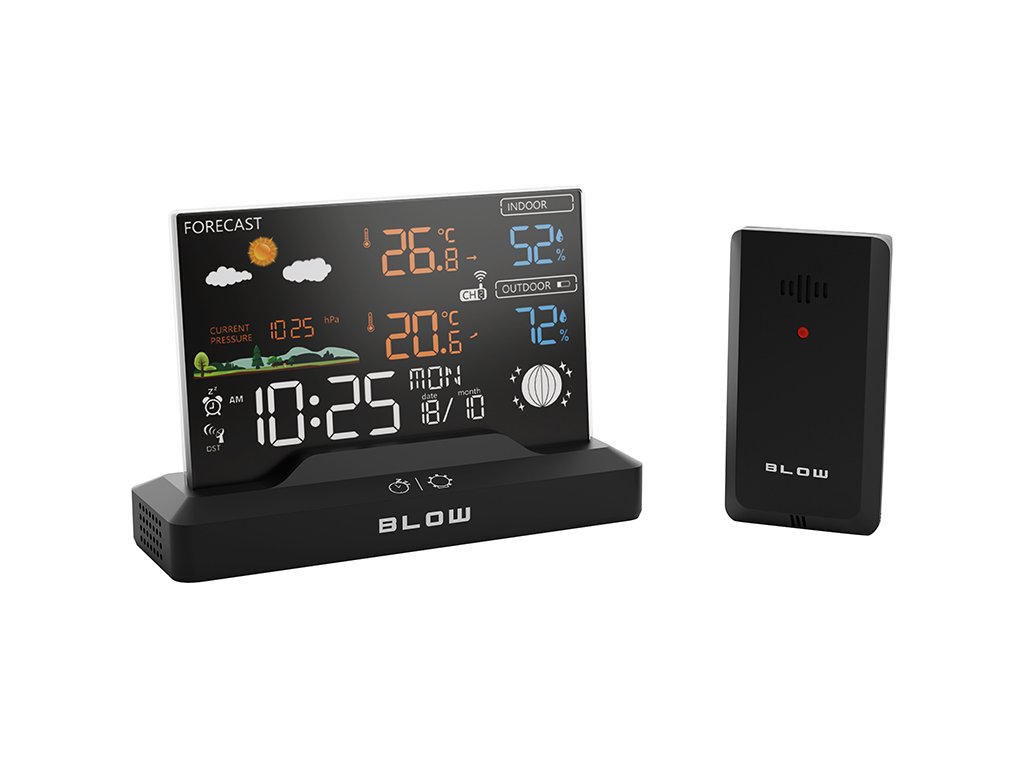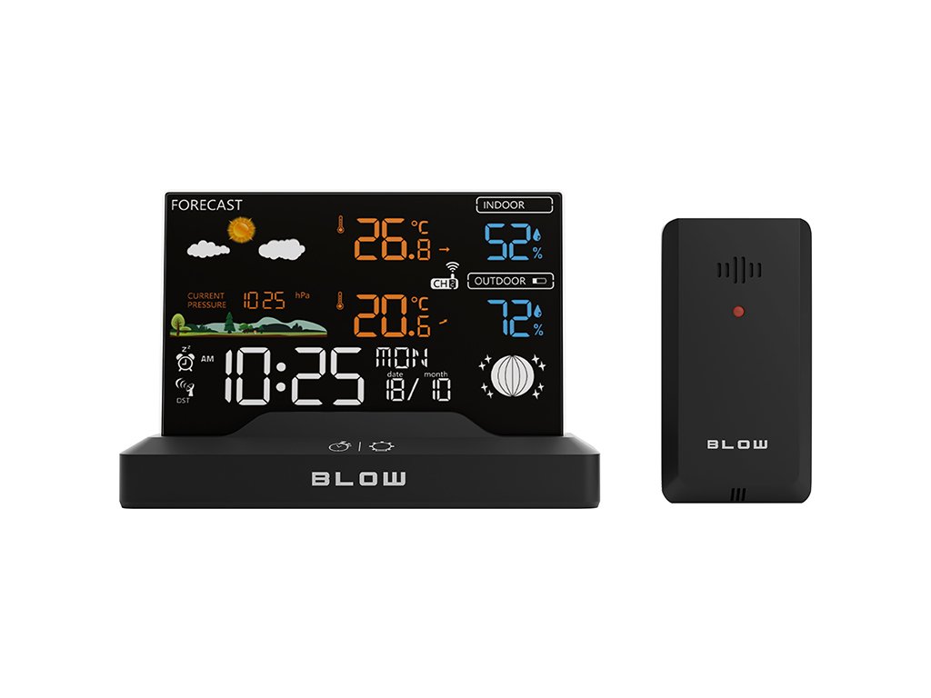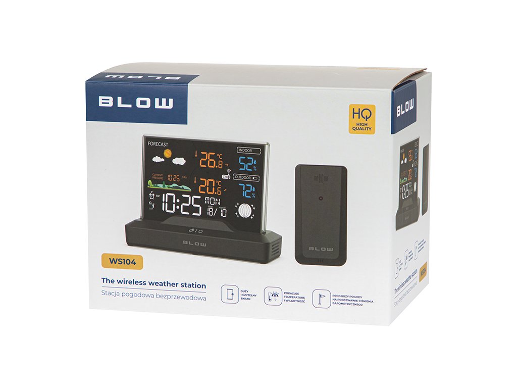 Az alapvető funkciókon túl a BLOW WS104 állomás barométert, időjárás-előrejelzést és riasztási funkciót kínál. Az aktuális légköri nyomásra vonatkozó információk lehetővé teszik a szabadtéri tevékenységek jobb megtervezését. A beépített memória rögzíti a maximális és minimális hőmérséklet- és páratartalom-értékeket, ami lehetővé teszi a változások követését az idő múlásával. Az óra 12/24 órás formátummal és a hét napjának megjelenítésével minden otthon univerzális kiegészítőjévé teszi ezt az eszközt.