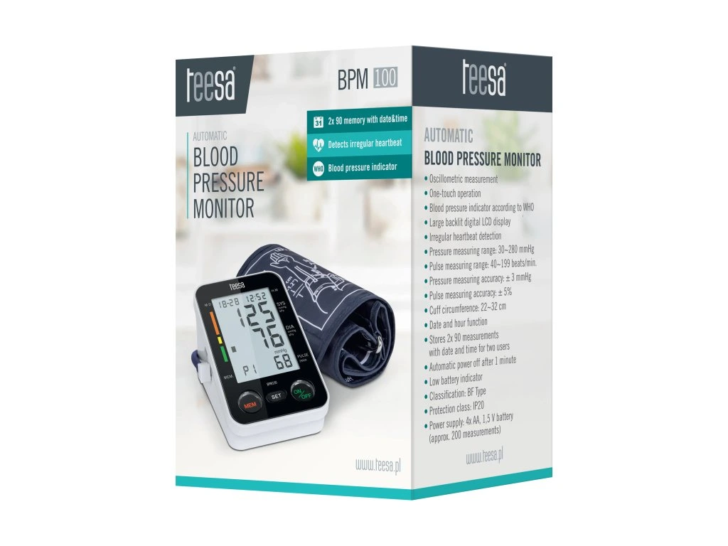 A Teesa BPM 100 karos vérnyomásmérő nélkülözhetetlen része otthonának. A készülék könnyen kezelhető, és az oszcillometrikus mandzsettás módszert használja a vérnyomás gyors és független ellenőrzésére. Fontos, hogy funkcióinak köszönhetően a készülék tájékoztatja Önt a szívritmuszavarral kapcsolatos rendellenességekről.