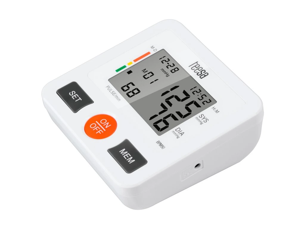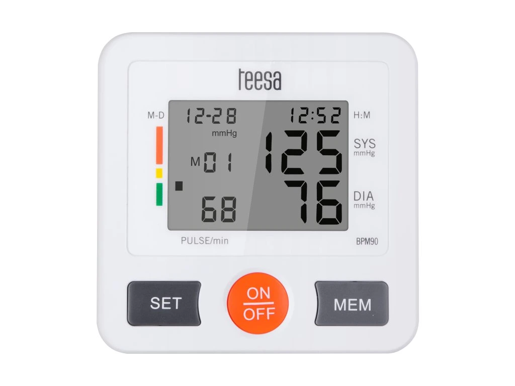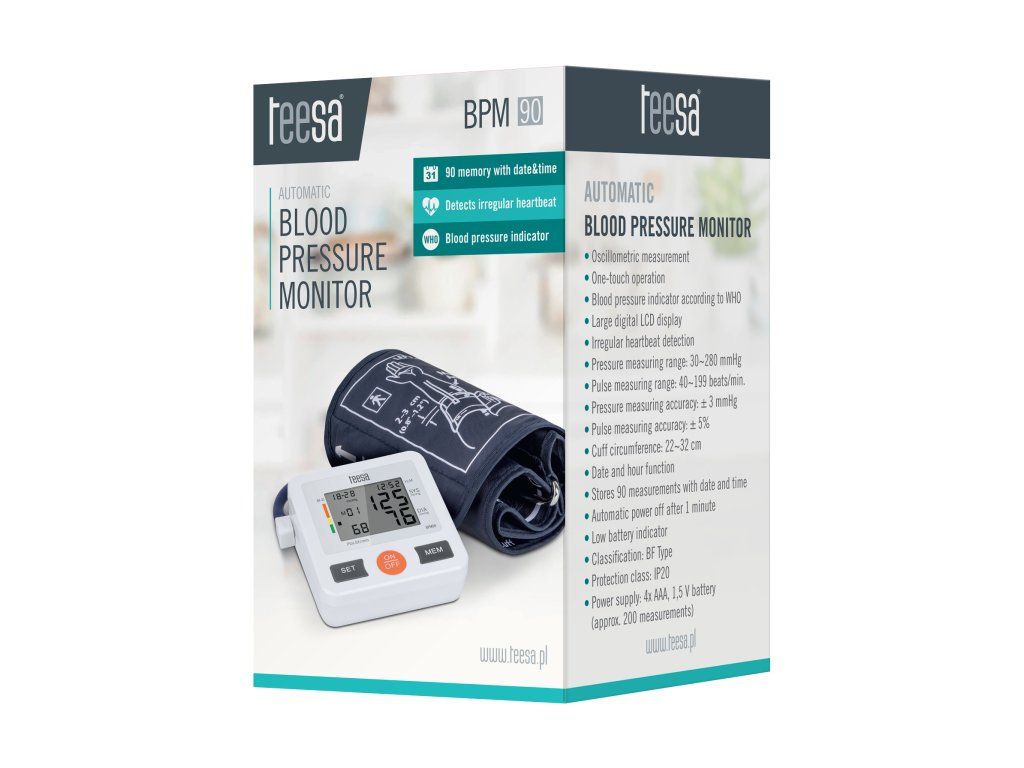 A Teesa BPM90 pontosságának köszönhetően a Teesa BPM90 segít magabiztosabbnak lenni, vagy időben megelőző intézkedéseket tenni! Az Ön vérnyomását a WHO szabvány szerint méri. Az eredmények jobb ellenőrzése érdekében a memóriafunkció elmenti az utolsó 90 mérést. Minden szükséges információ, azaz a vérnyomás- és pulzusmérés, valamint a dátum és az idő egyértelműen megjelenik az LCD kijelzőn.