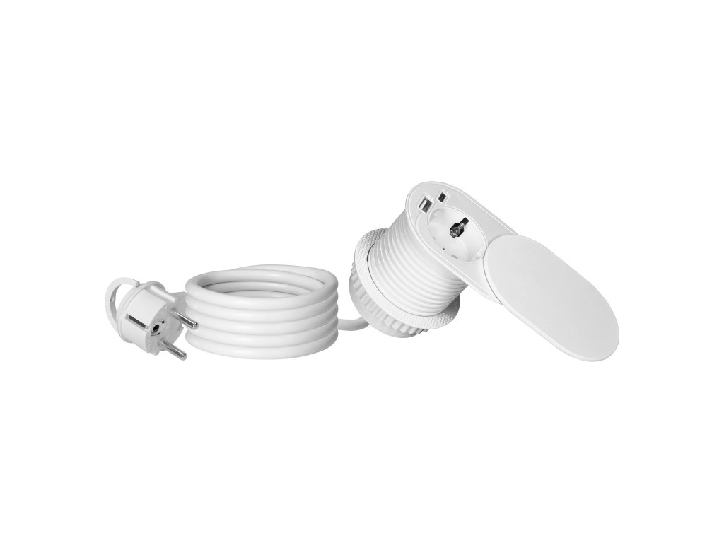 Bútorkonverter USB töltővel és tolófedéllel, 1,9 m-es kábel, 1x2P+E (Schuko), 2xUSB (A+C típus; PD20W), fehér