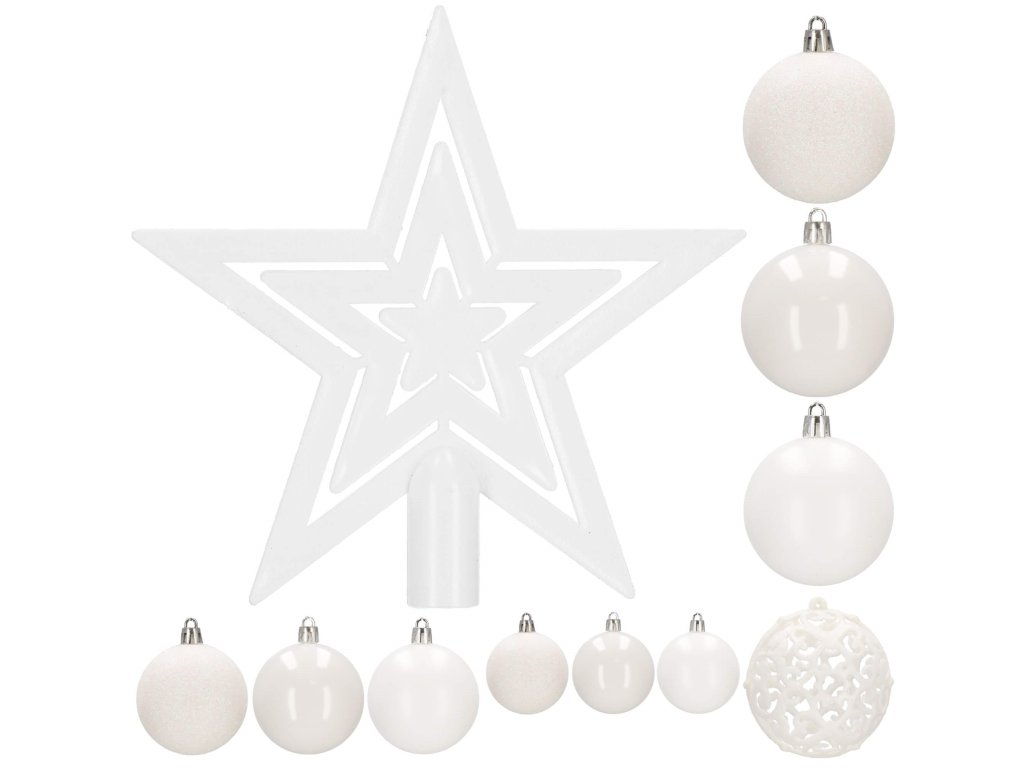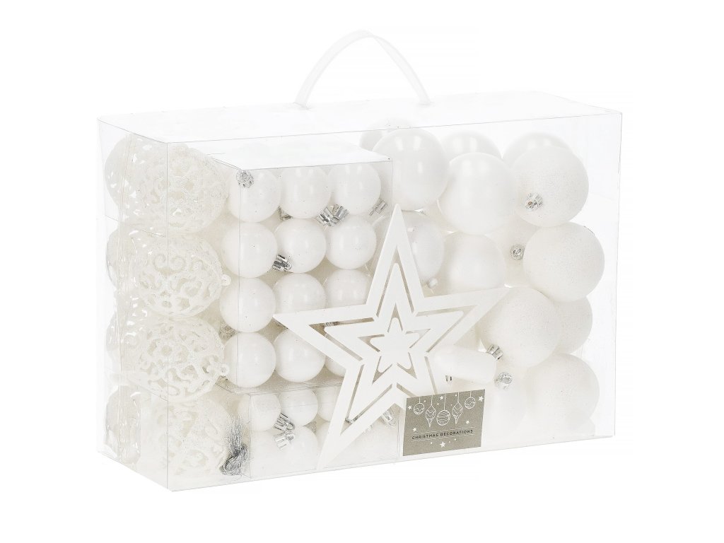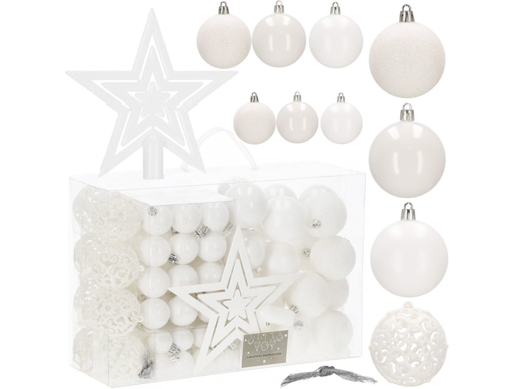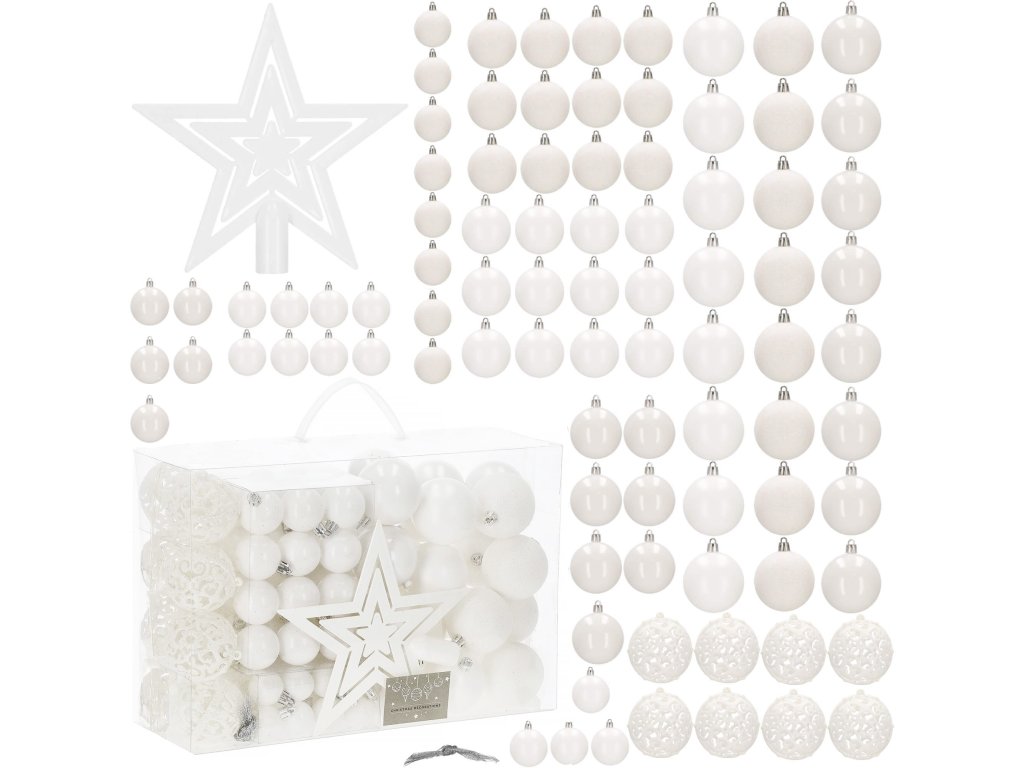 - Mennyiség: 100 darab díszgömb + 1 csúcsdísz a karácsonyfa tetejére