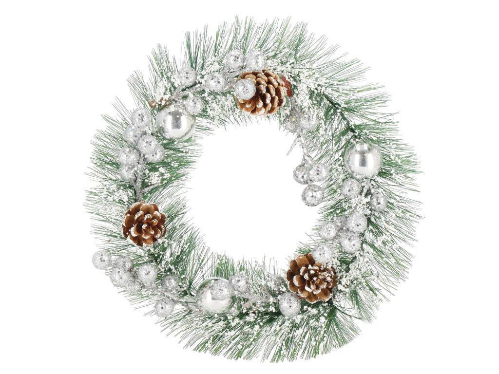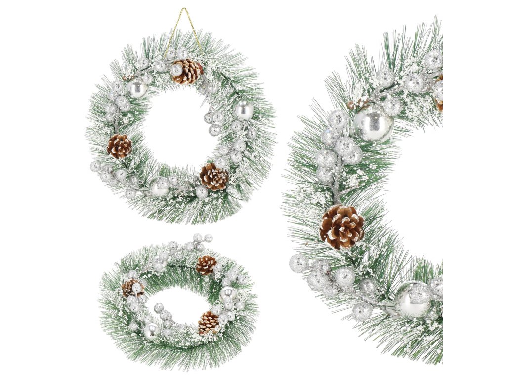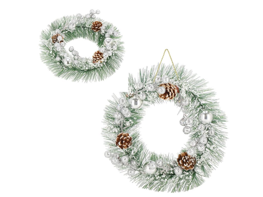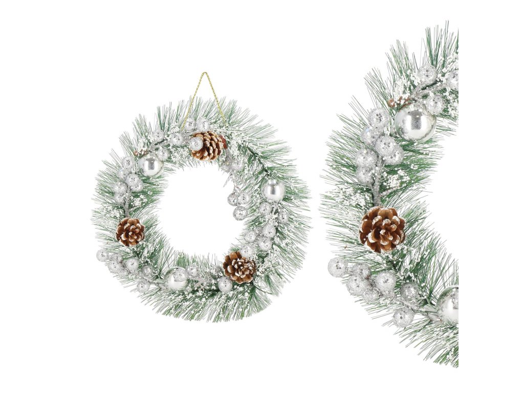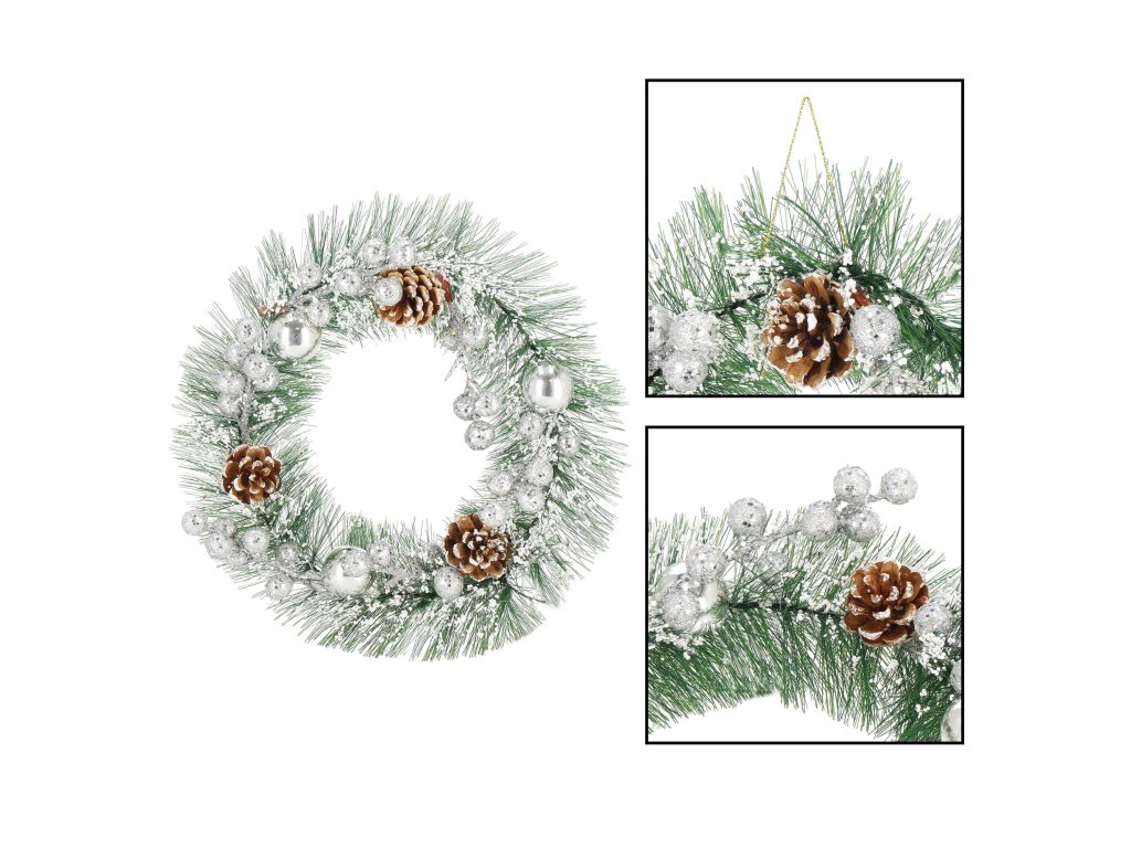 Minta: ezüst gömbökkel, ezüst golyós ágakkal, három tobozzal és műhóval díszített koszorú;