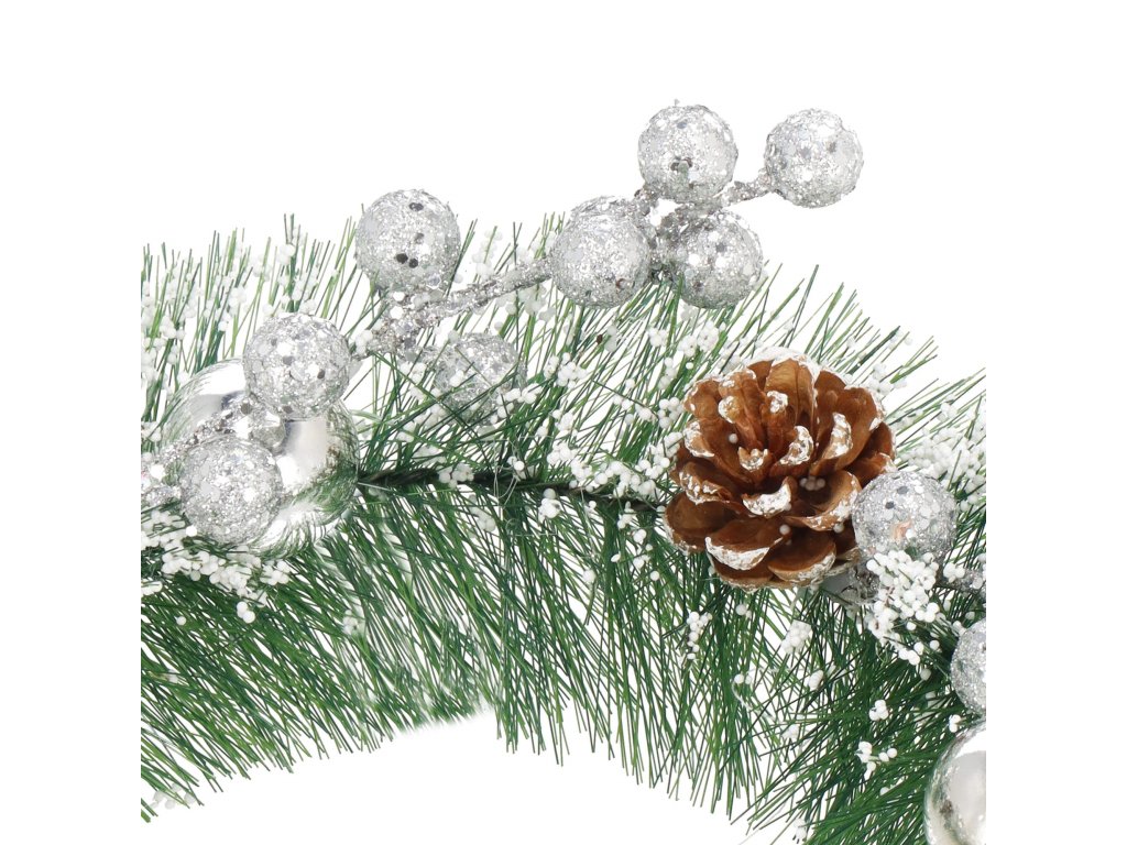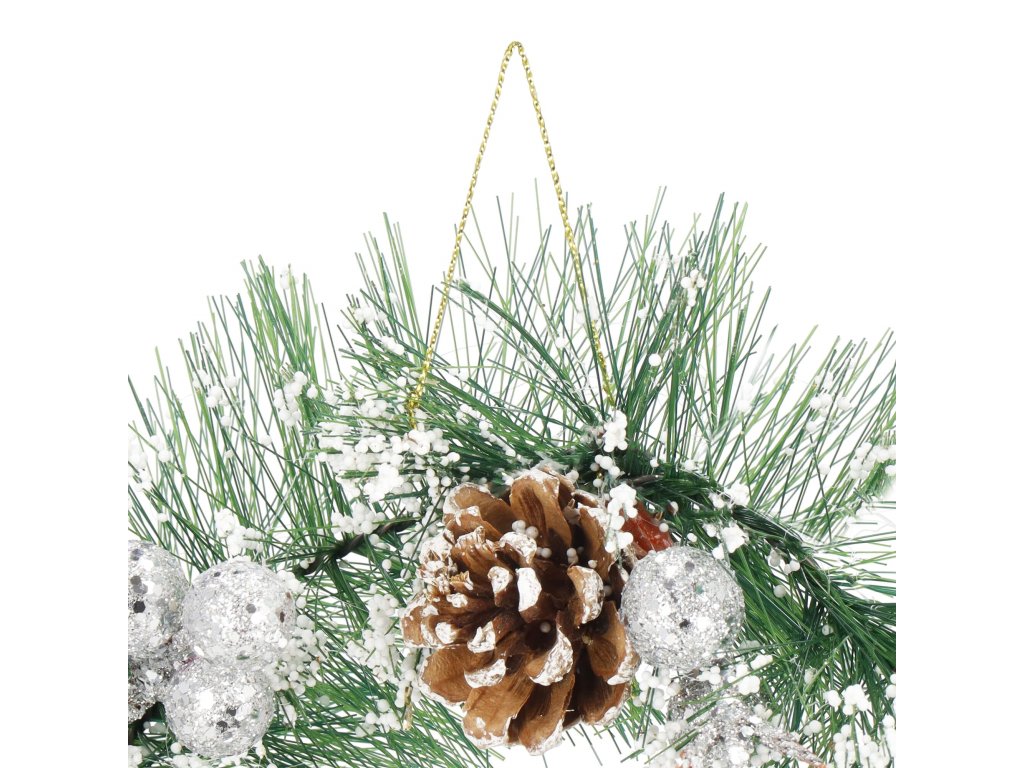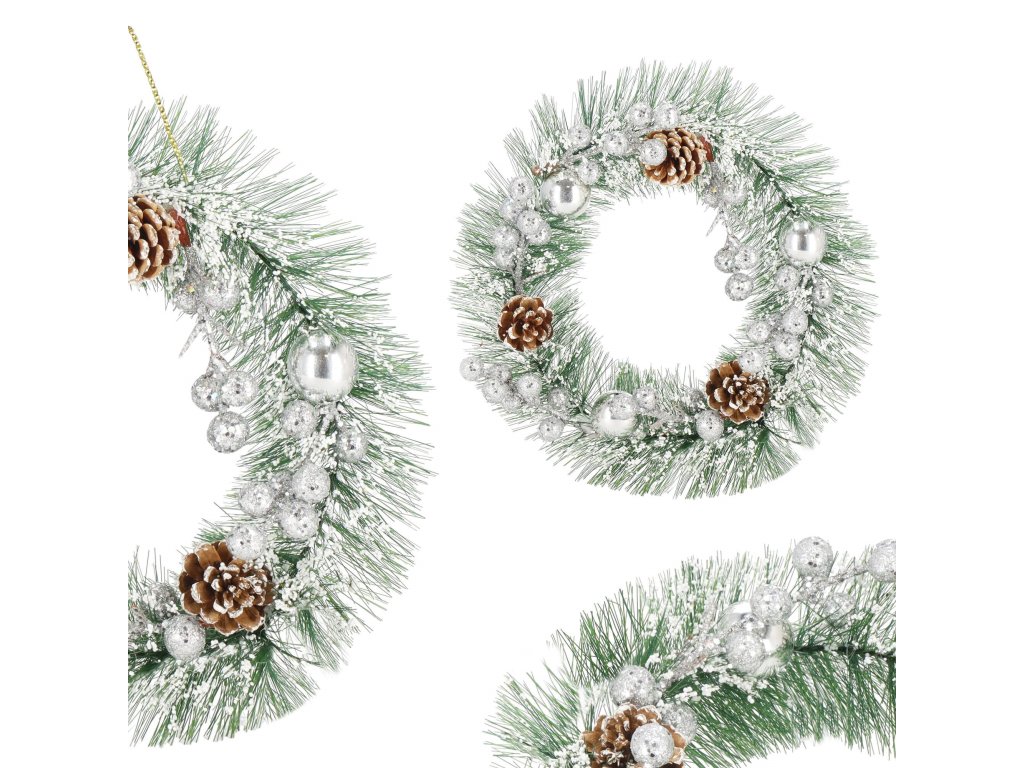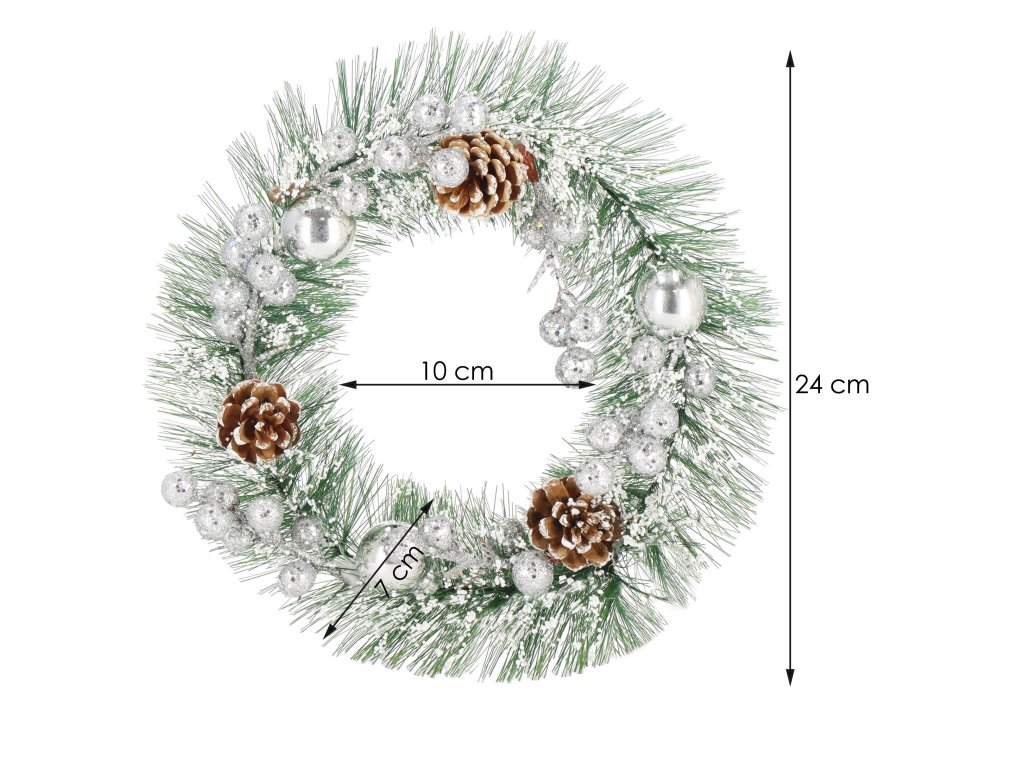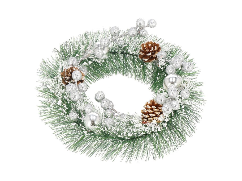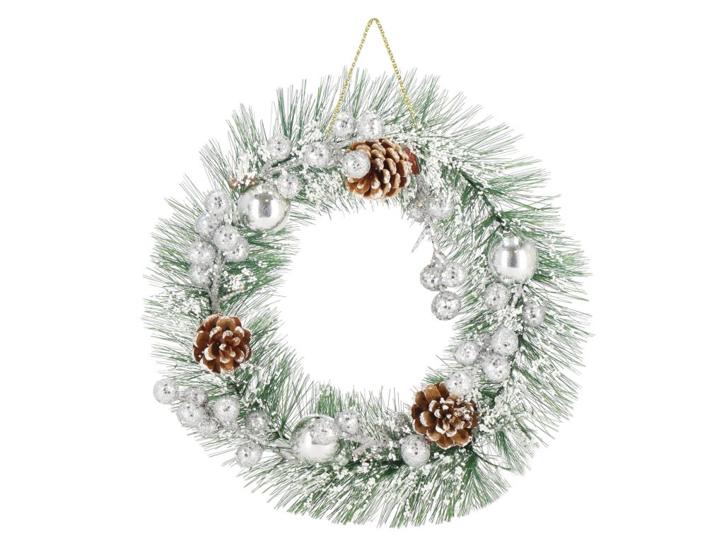 Minta: ezüst gömbökkel, ezüst golyós ágakkal, három tobozzal és műhóval díszített koszorú;