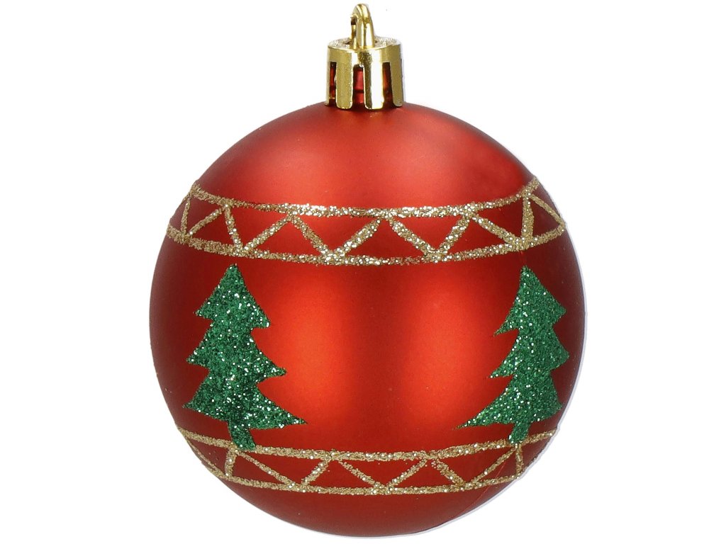 - 6x matt gömb - piros + fa és csilláms díszítések - 6 cm