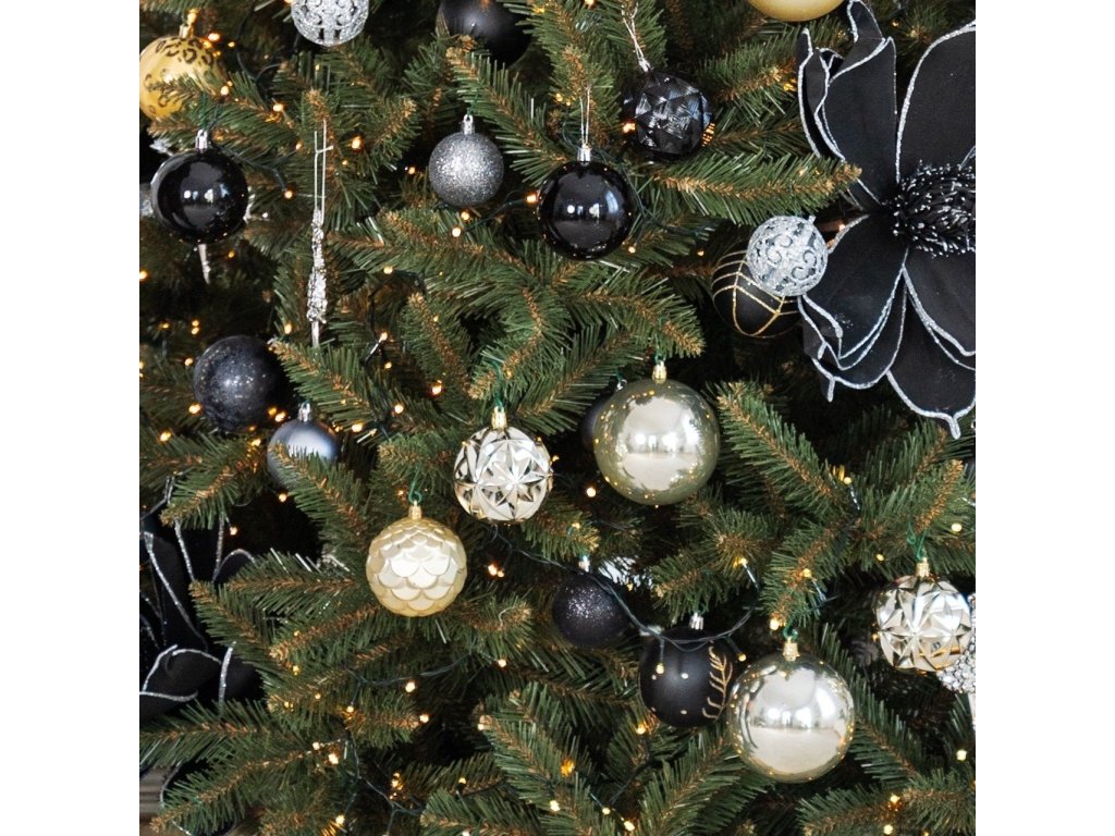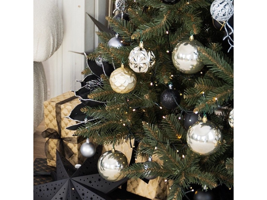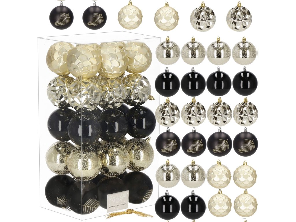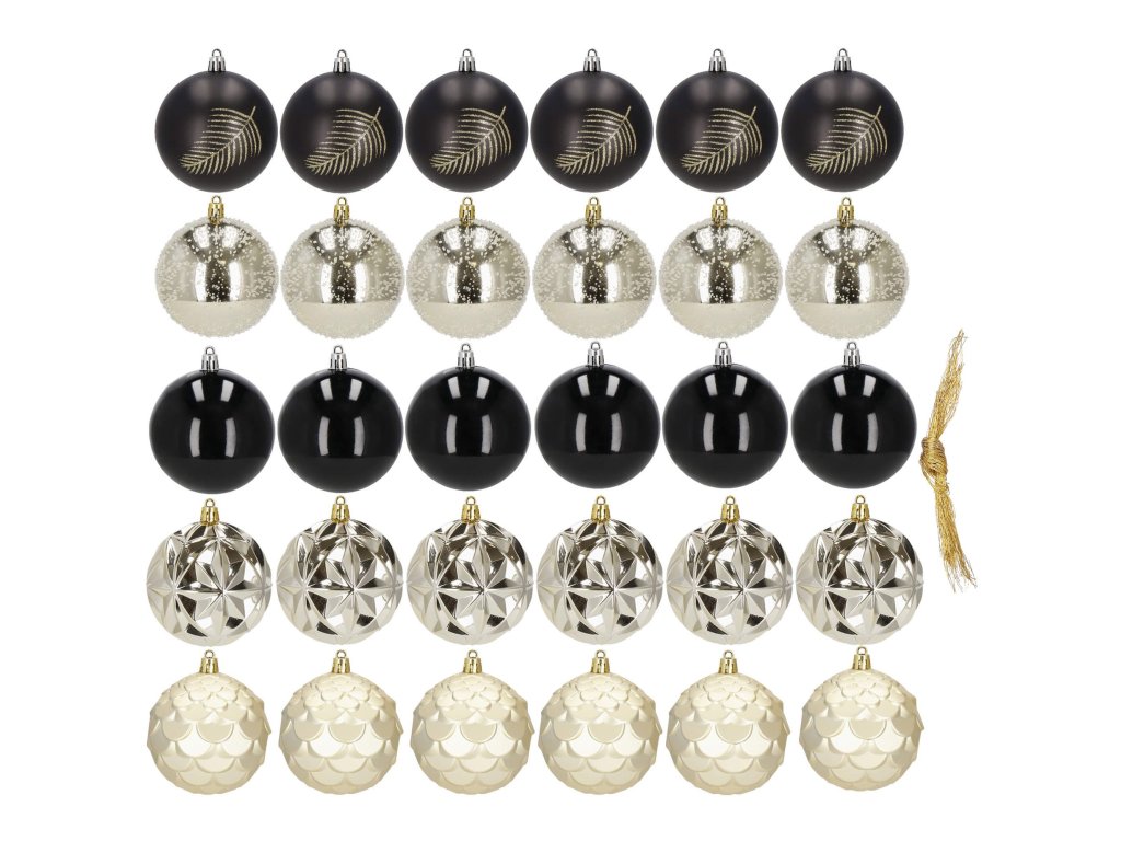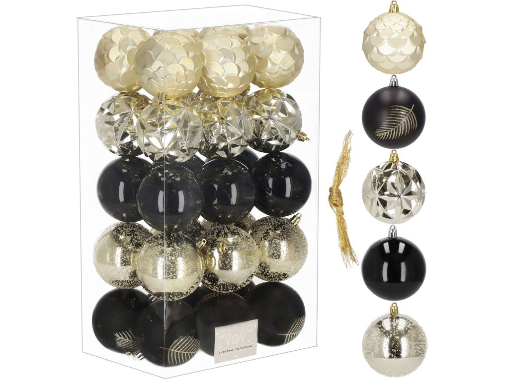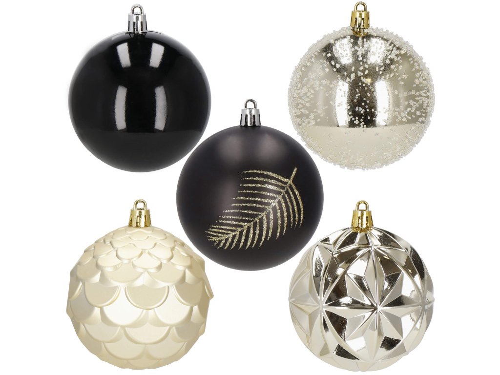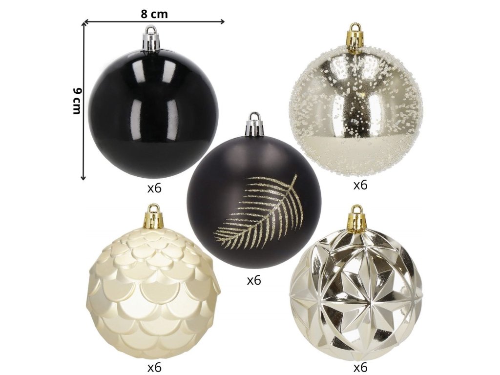 - 6x matt gömb - fekete + arany csillogó levél - 8 cm 6x fényes gömb - arany + finom struktúra - 8 cm 6x fényes gömb - fekete - 8 cm 6x fényes, textúrázott gömb - arany - 8 cm 6x matt, textúrázott gömb - arany - 8 cm