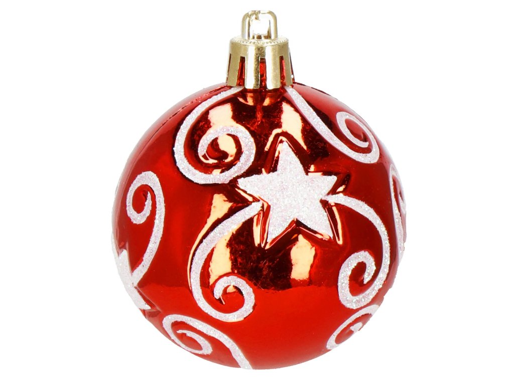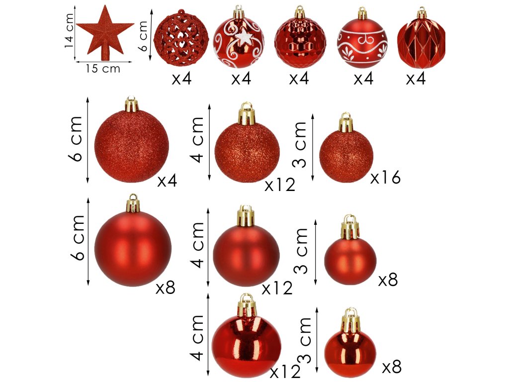 - 32x csillogó piros dísz: 6 / 4 / 3 cm