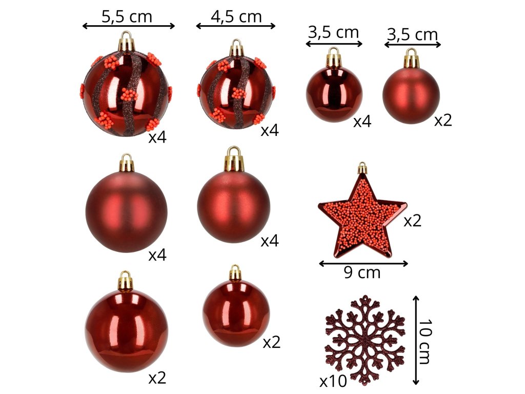 - 3 x kis fényes gömb - 3,5 / 5 cm3 x kis félmatt gömb - 3,5 / 5 cm4 x közepes fényes gömb - 4,5 / 6 cm4 x közepes félmatt gömb - 4,5 / 6 cm4 x közepes csillámos fényes gömb - 4,5 / 6 cm2 x nagy fényes gömb - 5,5 / 7 cm4 x nagy félmatt gömb - 5,5 / 7 cm4 x nagy csillámos fényes gömb - 5,5 / 7 cm2 x csillag alakú gömb - 9 / 10,5 cm10 x csillámos hópihe - 10 cm