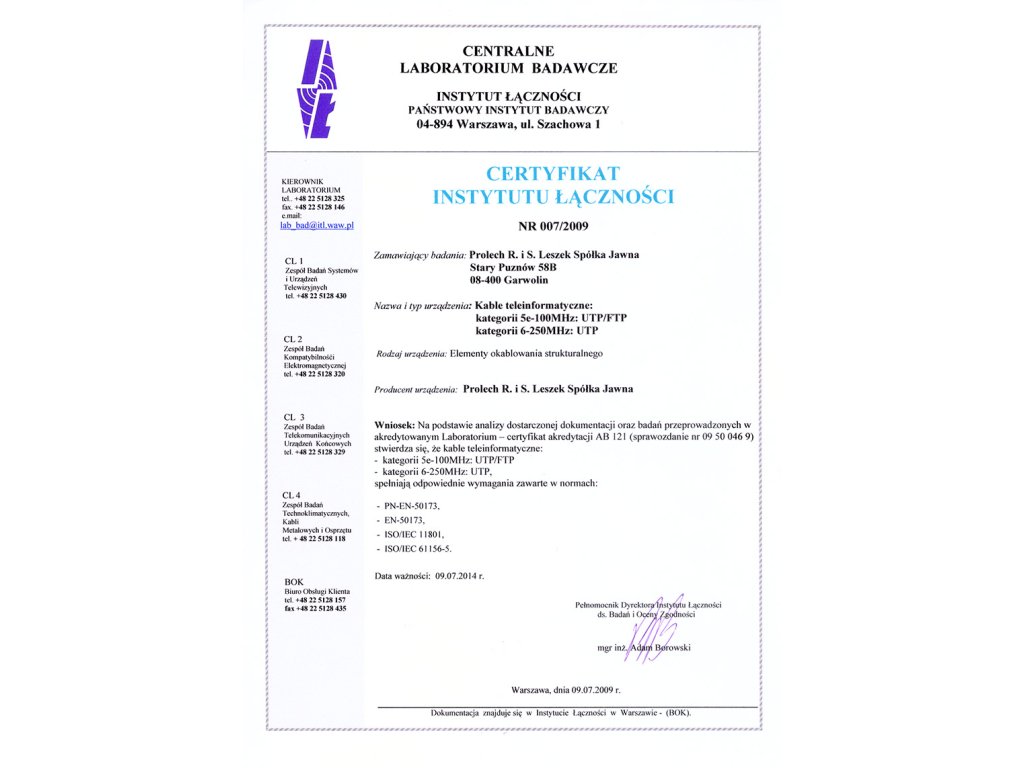- Műszaki adatok: TIA/EIA 568-E kat. 5, EN 50289, ISO/IEC IS 11801,