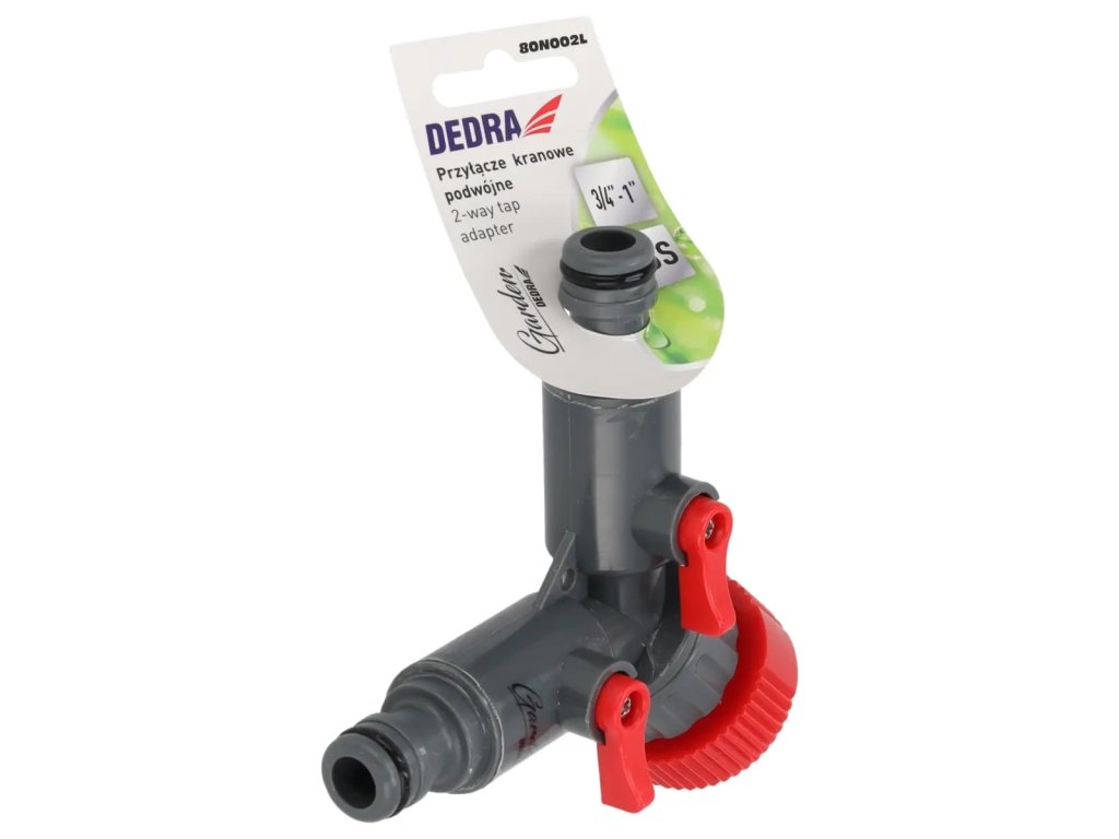 A GARDEN DEDRA 80N002L dupla csapcsatlakozó egy olyan adapter vagy csatlakozó, amelyet két készülék egy csaphoz való csatlakoztatására használnak.