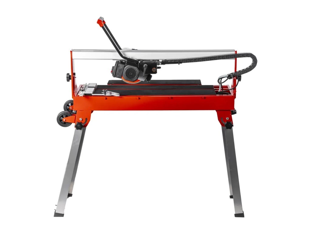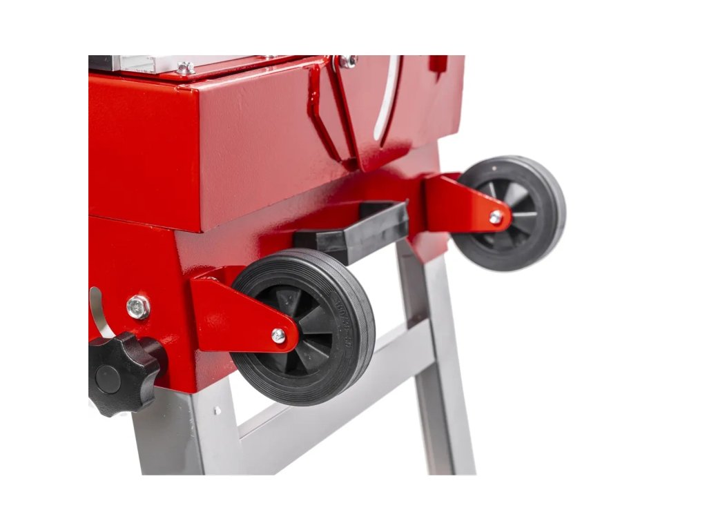 A vágógépben kettős vízhűtő rendszert alkalmaztak, amely a víz segítségével működik, amely hűtő és porellenes funkciót tölti be, így hatékonyan korlátozza a törmelék szétszóródását a munka során. A hajtogatható lábak és a további szállító kerekek megkönnyítik az eszköz szállítását és tárolását. A vágógép precisa szögtartóval is fel van szerelve, amely lehetővé teszi a szögek precíz meghatározását, míg a mélységállító funkció lehetővé teszi a vágás mélységének a felhasználó aktuális igényeihez való igazítását.