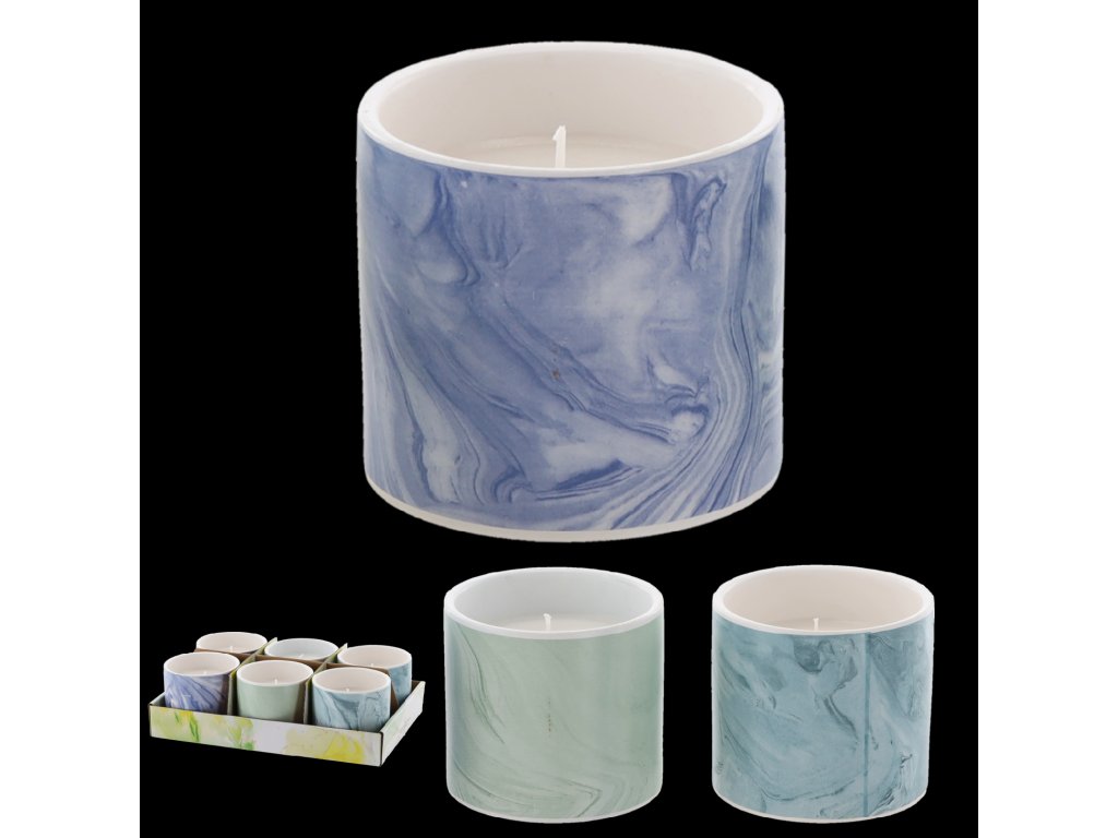 Dekoratív gyertya elegáns kerámia tartóban, három márvány színben elérhető.A viaszkeverék citronella illóolajat tartalmaz, amely híres a szúnyogok ellenhatásáról.