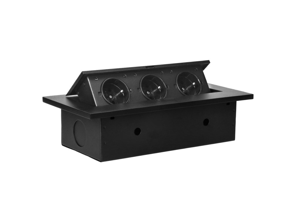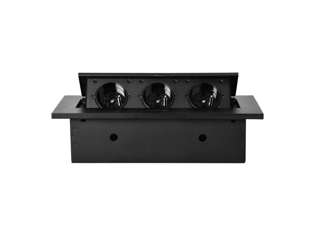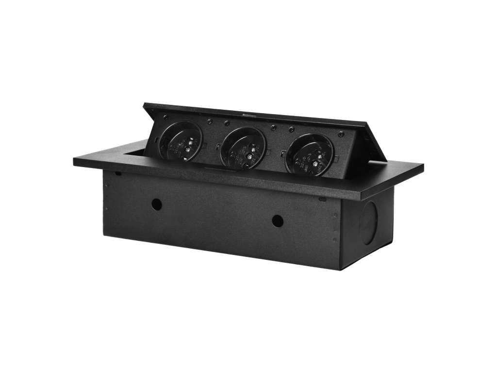 Három darab 2P+Z elektromos aljzatból álló készlet kihúzható felső fedélben. Asztalokba, asztallapokba és íróasztalokba történő belső beépítésre tervezve, függőleges és vízszintes helyzetben egyaránt, hozzáférést biztosítva az elektromos aljzatokhoz.Műszaki leírás