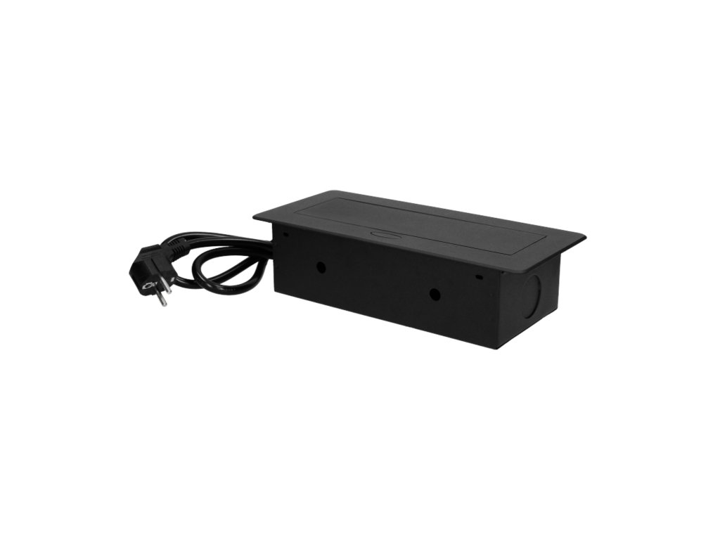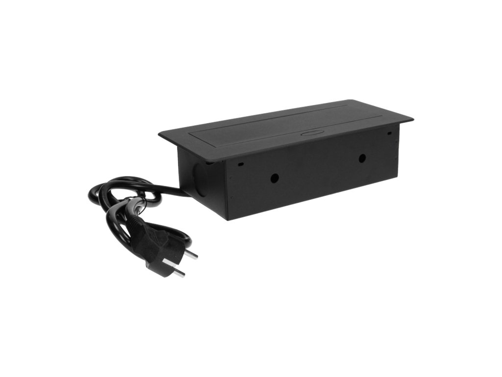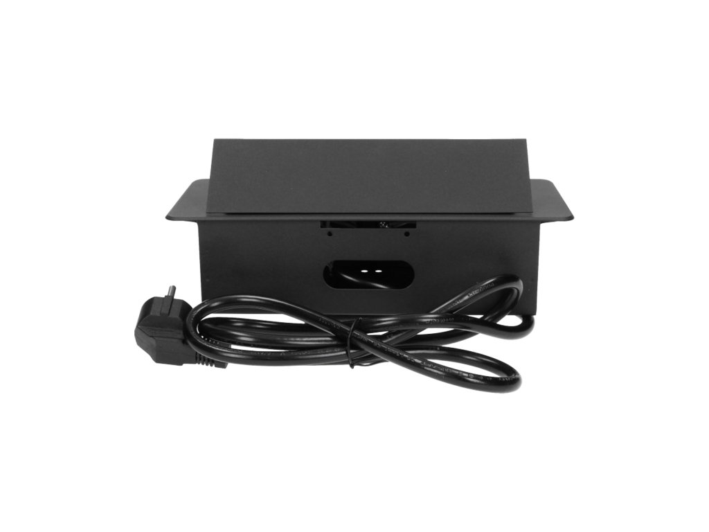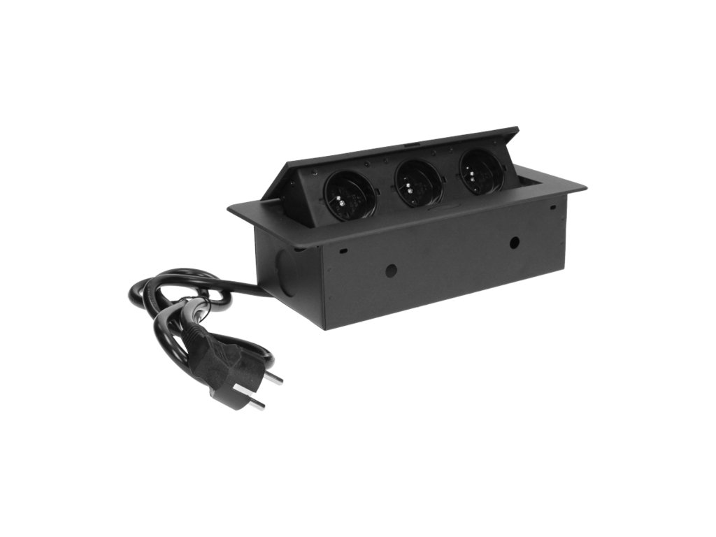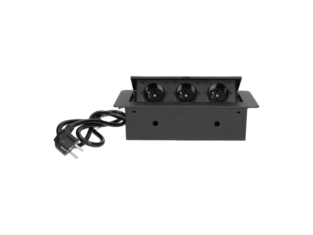 Három darab, földeléssel és áramvédelemmel ellátott hálózati aljzatkészlet 2500 W maximális névleges teljesítménnyel. Ezek az aljzatok kihúzható fedélben vannak elhelyezve. A készüléket íróasztalokba, munkalapokba és asztalokba történő beépítésre tervezték. Nagyon lapos és maratott peremével a panel elegánsan mutat bármely asztallapon, és nem nehezíti a tisztítást. Az aljzatok függőlegesen és vízszintesen is felszerelhetők, így könnyen csatlakoztathatók más eszközök a tápegységhez. A fiókpanel nyomásra záródik és nyílik. A készlet 3 m hosszú kábellel van felszerelve. Kapható színek: fekete, ezüst.Általános információk: