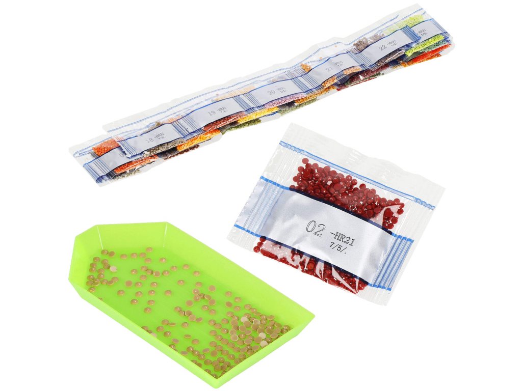 1x erős vászon nyomtatott képpel, amely ábrázolja sárkányfej és index, amely a betűket színekhez, illetve a számokat a gyémántok színéhez rendeli