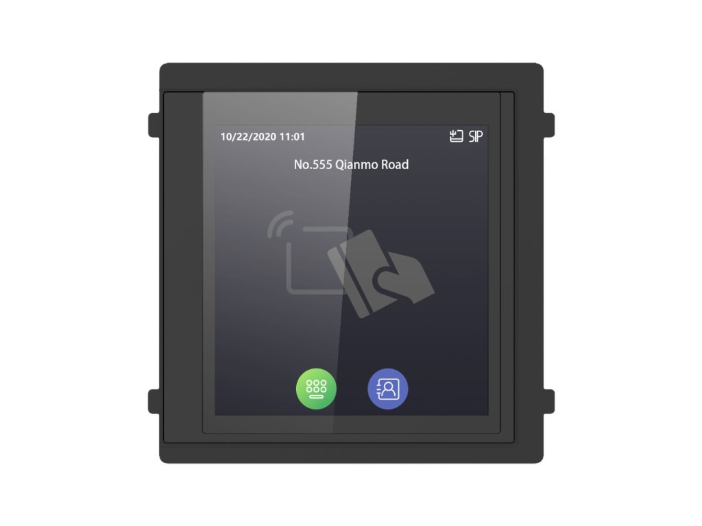 DS-KD-TDM márka Hikvision egy kártyaolvasóval felszerelt érintőképernyős modul Mifare, amely IP videó kaputelefonokhoz készült. Az eszköz rendelkezik 4" érintőképernyővel mérete 480x480, lehetővé teszi, hogy a képernyőn megjelenített kapcsolatok listájából kiválasszuk a helyszínt. Az egész modul stílusos, tartós házba van zárva, amely a IP65.