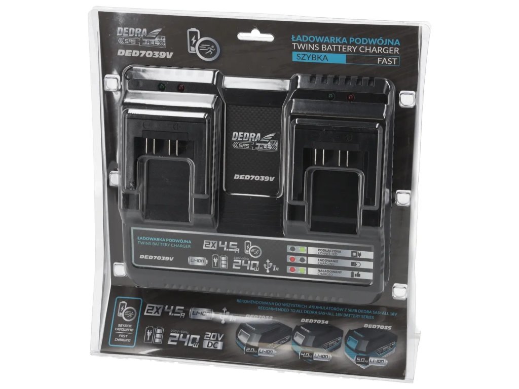 Gyorstöltő a SAS+ALL sorozatú akkumulátorok (DED7032, DED7034, DED7035, DED6936, DED6937) újratöltéséhez . A két akkumulátorhely lehetővé teszi a SAS+ALL elektromos szerszámok akkumulátorának gyors feltöltését. A beépített ventilátorok megvédik a cellákat a töltés közbeni túlmelegedéstől, növelve az akkumulátor élettartamát még a forró napokon történő töltés során is. A töltő két USB-porttal rendelkezik az előlapon az elektronikus eszközök, például okostelefonok, Bluetooth hangszórók stb. töltéséhez.