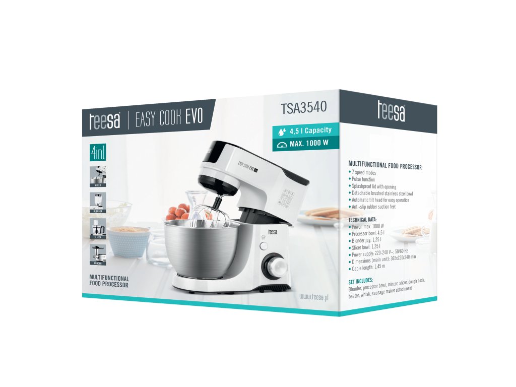 Így a segítője is segíthet Önnek. A Teesa EasyCook EVO ételfeldolgozó teljesítménye megfelel az elvárásainak. Az 1000 W-os motorral a legigényesebb ételeket is pillanatok alatt összegyúrja.