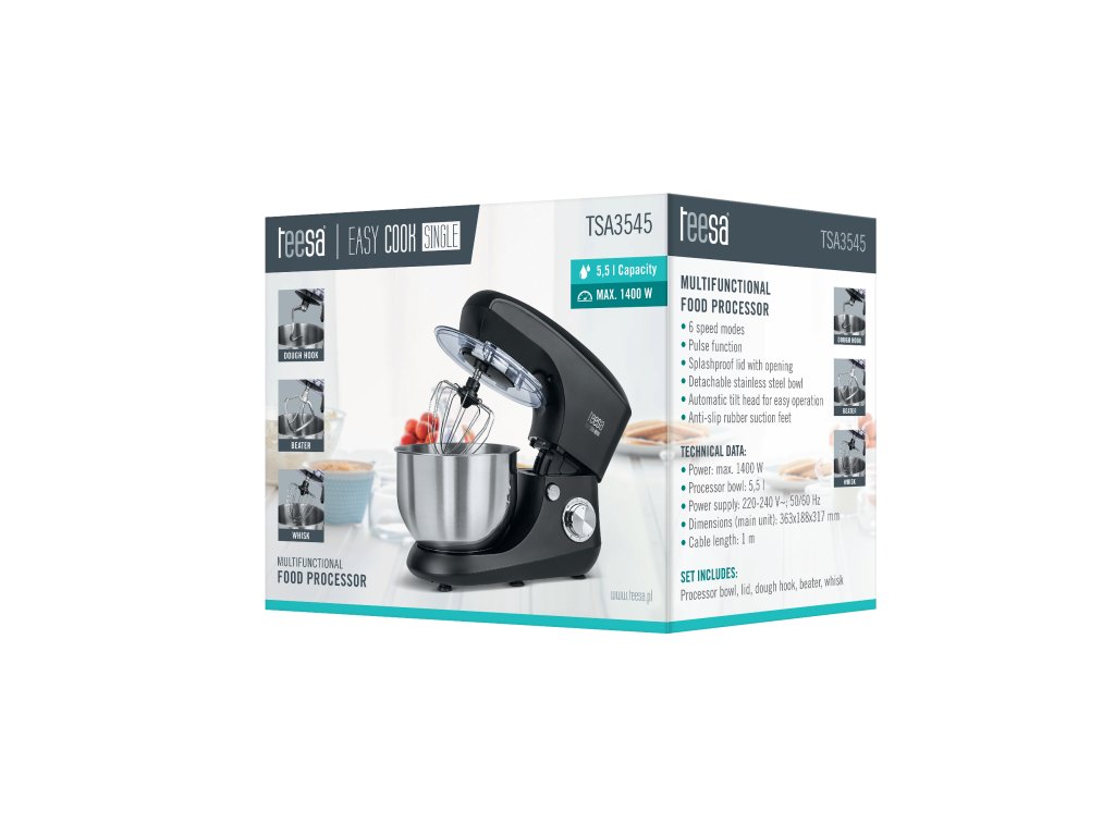 Ne pazaroljon energiát a massza vagy a tészta kézzel történő gyúrására. Hagyja, hogy segítsünk Önnek. A Teesa EasyCook SINGLE ételfeldolgozó minden elvárásának megfelel. Válasszon egyet a három mellékelt tartozék - tésztakampó, habverő vagy keverő - közül, és az 1400 wattos motorral a legigényesebb ételek gyúrása is gyerekjáték lesz.