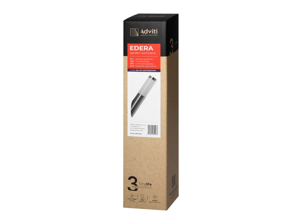 Az EDERA kerti lámpa az olyan kültéri lámpák sorozatába tartozik, amely kétféle fali lámpát és egy oszlopos lámpát tartalmaz, lehetővé téve egy összefüggő kerti megvilágítás létrehozását. A sorozatot esztétikával, tartóssággal és funkcionalitással tervezték. Ennek köszönhetően tökéletesen működik dekoratív és funkcionális elemként is.Az EDERA rozsdamentes acélból készült, amely biztosítja a tartósságot évekig. Az IP44 védettség megóvja a lámpatestet a portól és a víztől, így a lámpák kültéren is telepíthetők függetlenül a zord időjárási körülményektől. Továbbá, a magas ütésvédelem IK08 védelmet nyújt a lámpának külső tényezők ellen.