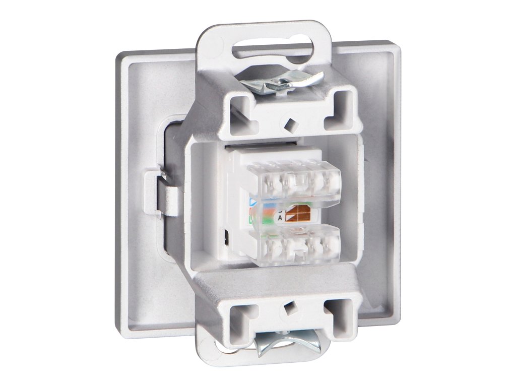 Moduláris sorozat szimmetrikus keretlappal (1-, 2-, 3-, 4-, 5-modulhoz), amely lehetővé teszi a termék vízszintes és függőleges pozícióban történő szerelését. A modern gyorskötő mechanizmus (a vezetékeket közvetlenül a házba tolva lehet csatlakoztatni) biztosítja a vezetékek biztonságos és stabil szerelését és eltávolítását. A konnektorok hagyományos csavaros csatlakozásokkal vannak ellátva. A csatlakozók belső kialakítása garantálja a vezetékek biztonságos csatlakozását 0,75 mm? és 2,5 mm? között. Erős és robusztus rögzítőlemezhálózat és kiváló minőségű, önvisszahúzó elemek lehetővé teszik a dobozban történő stabil és biztonságos rögzítést. Speciális rugós elemek segítik a keret házba történő illeszkedését.Egyszeres RJ45 számítógép aljzat, árnyékolatlan Cat5. Süllyesztett szerelésre alkalmas. Beltéri használatra javasolt (IP20).