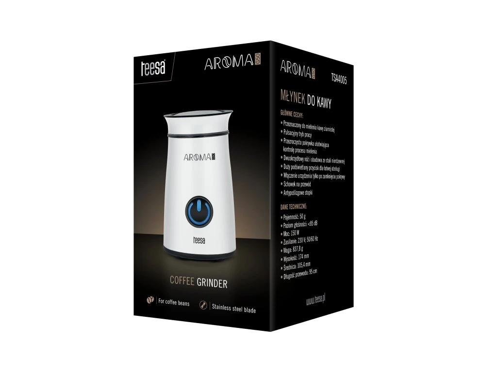 Erős fekete, lágy tejjel - bármilyen ízlése is van, a frissen őrölt kávébabból készült kávé a legfinomabb. Felejtse el a kézi őrlőket, és válassza a Teesa G50 elektromos darálót, amely 150 W-os motorjának és dupla szárnyú pengéjének köszönhetően még a legnehezebb babok őrlését is rendkívül gyorsan és kényelmesen végzi. Előfordult már, hogy kézzel történő őrlés közben kiömlött a kávé? A G50 darálót csak akkor tudja elindítani, ha a fedele zárva van, így nem kell aggódnia, hogy véletlenül bekapcsolja.