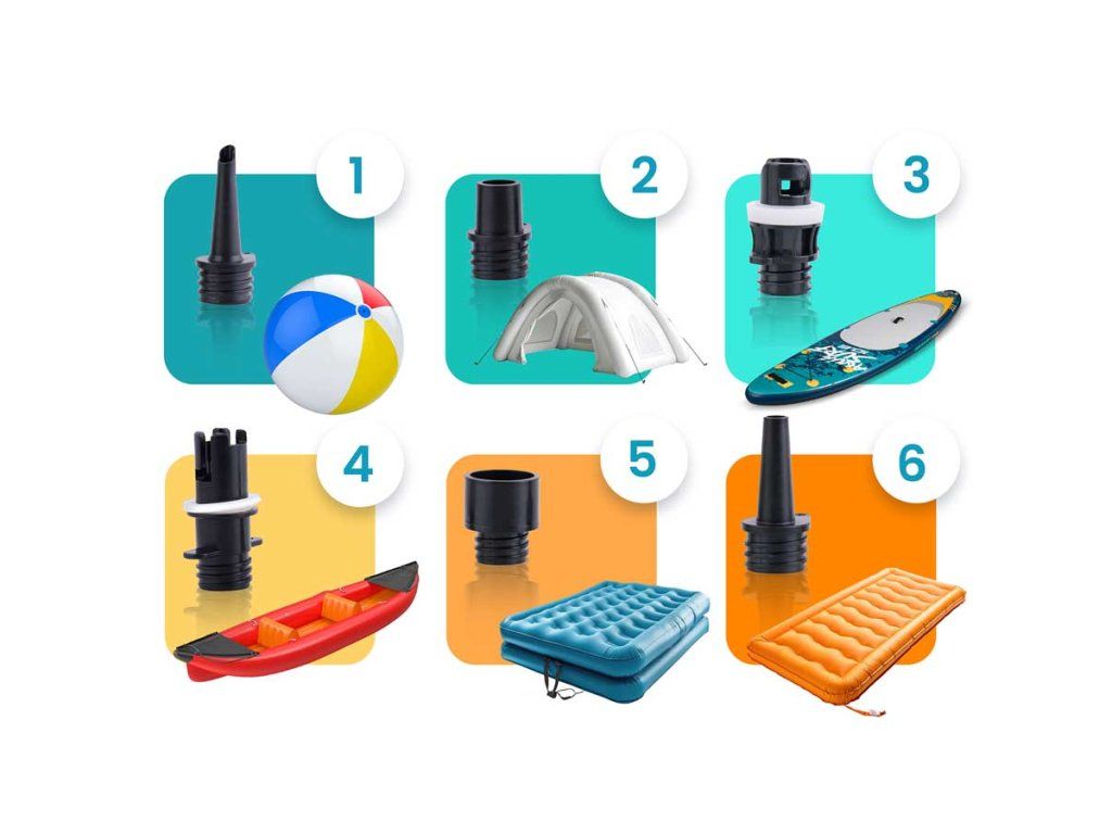 A készlet 6 különböző végződést tartalmaz, így a pumpa nemcsak SUP-deszkákhoz használható.