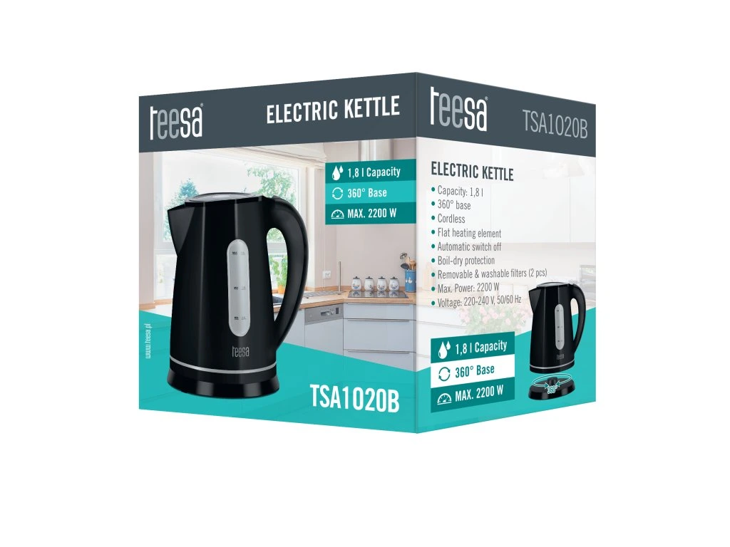 A Teesa TSA1020 kiváló minőségű műanyagának és a fehér vagy fekete színben való elérhetőségének köszönhetően tökéletesen illeszkedik szinte minden konyhába. A vízforraló nagy, 1,8 literes űrtartalmával és 2200 W maximális teljesítményével nagy mennyiségű vizet képes gyorsan felforralni, miközben a rendkívül csendes fűtőelem szinte zajtalan működést biztosít. A termék forgatható talppal rendelkezik, így jobb- és balkezes felhasználók számára is kényelmesen használható. Az automatikus kikapcsolás és a víz nélküli bekapcsolás elleni védelem biztosítja a biztonságos használatot, a működés közbeni háttérvilágítás pedig emlékeztet arra, hogy a vízforraló be van kapcsolva. A termék kivehető szűrővel rendelkezik , amely megakadályozza a vízforraláskor képződő vízkő távozását.