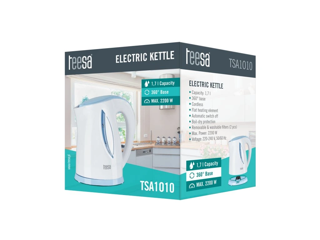 A TSA1010 egy praktikus, vezeték nélküli vízforraló 1,7 literes űrtartalommal. Fehér testével és kék díszítésével ez a vízforraló tökéletesen illeszkedik bármely konyha berendezésébe, minőségi anyaga pedig hosszú élettartamot garantál. A vízforraló beépített lapos fűtőberendezéssel rendelkezik, amely gyors vízforralást biztosít, és megkönnyíti a készülék tisztán tartását. A termék be- és kikapcsoló vízvédelemmel és automatikus kikapcsolással van felszerelve a túlmelegedés megelőzése érdekében. A forgatható talpnak köszönhetően bármilyen pozícióban elhelyezhető, a kivehető szűrő pedig véd a vízforralás során képződő vízkő ellen.