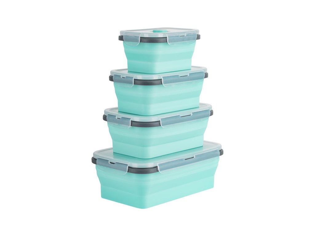anyag: szilikon + műanyag Csomagban: 4 tartály Méretek és kapacitás: - 125 x 90 x 57 mm / 350 ml - 160 x 102 x 57 / 500 ml - 178 x 115 x 60 / 800 ml - 210 x 132 x 67 / 1200 ml