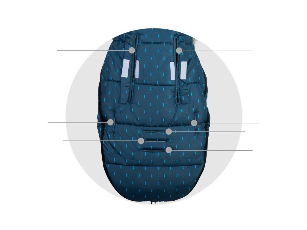 - rögzítőelem, amely megakadályozza, hogy a hálózsák elcsússzon a babakocsiban,