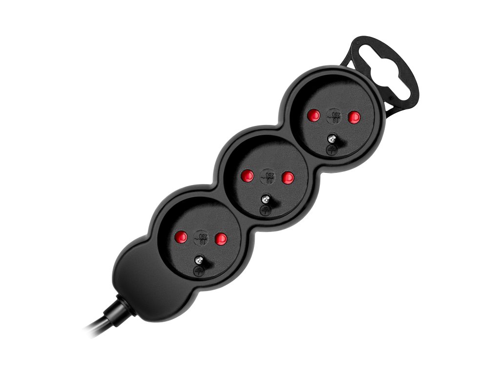 A 3-as elosztósor egyszerűen használható és biztonságos megoldás irodákban és háztartásokban. A termék fekete színű, 3 francia típusú fő aljzattal (2P+E), H05VV-F 3x1,5 mm2, 1,4 m hosszú kábel, lapos dugó kényelmes fogantyúval, biztonsági redőnyök, kényelmes akasztó, ha például falra kell akasztani a készüléket, PVC szigetelés. Beltéri használatra (IP20).