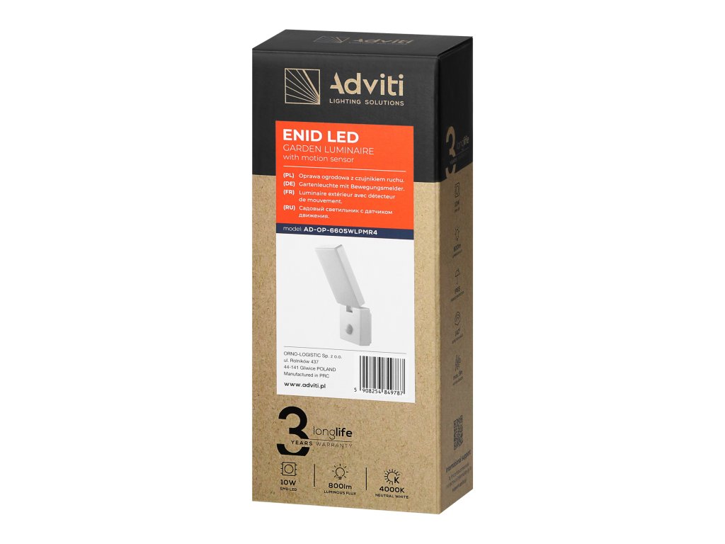 Az ENID LED egy PIR mozgásérzékelővel felszerelt kerti lámpatest, amely tökéletes a szabadban az épületek homlokzatainak, ingatlanoknak, kerteknek, teraszoknak vagy garázsoknak a megvilágítására. A beépített mozgásérzékelő csak akkor kapcsolja be a fényt, amikor szükség van rá, növelve így az energiahatékonyságot.A 800 lm fényáram 10 W-on hatékony megvilágítást biztosít. A 4000 K szín-hőmérséklet semleges fehér fényt bocsát ki, amely ideális a szabadtéri területek kiemelésére. A lámpa mozgatható lámpaernyővel van felszerelve, amely lehetővé teszi a fény irányának pontos beállítását vízszintesen (225° balra, 45° jobbra) és függőlegesen (60°). A nagyon széles fénycsóva elősegíti a környezet egyenletes megvilágítását.