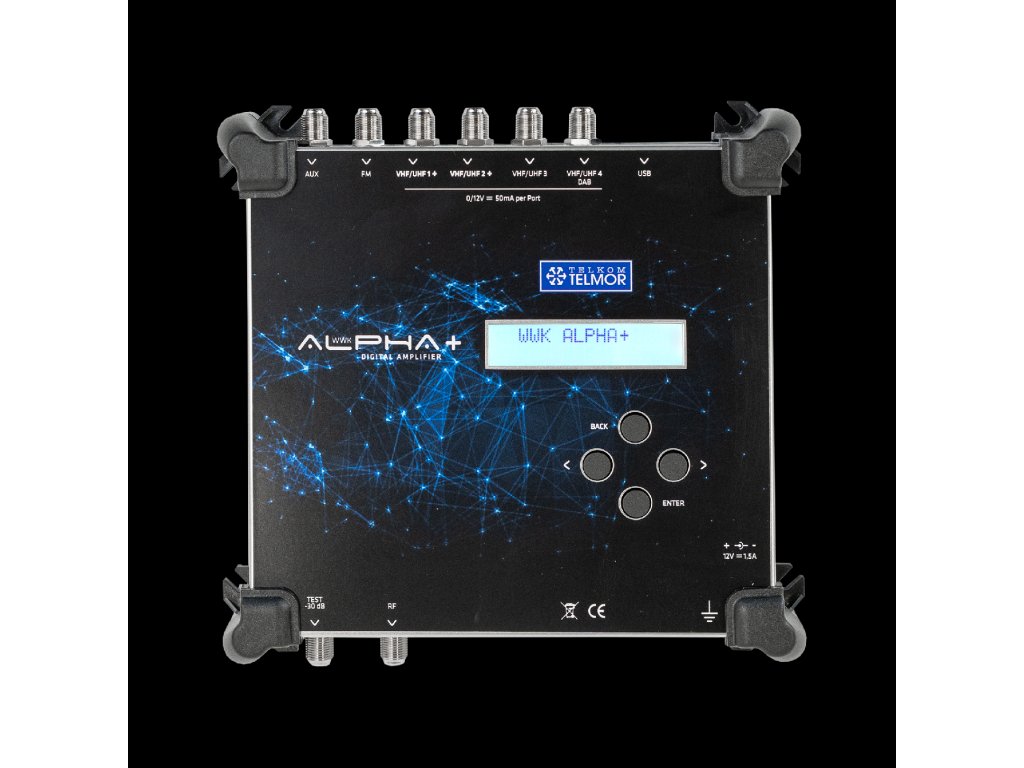 12 V/50 V/mA (VHF/UHF1-3, VHF/UHF-4/DAB) Működési hőmérséklet: 0~+50 Celsius fok A termék méretei: 200 x 190 x 48 mm Nettó súly: 0,3 kg A WWK ALPHA+ egy új generációs szelektív (csatorna)erősítő.