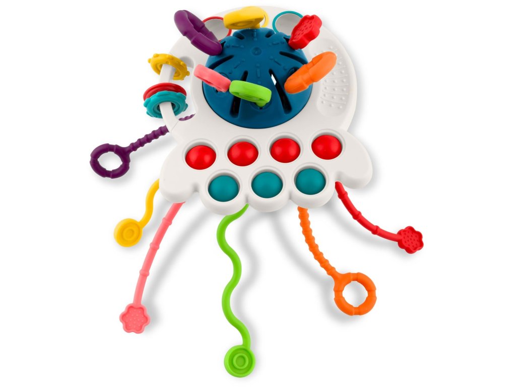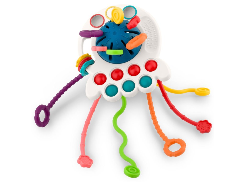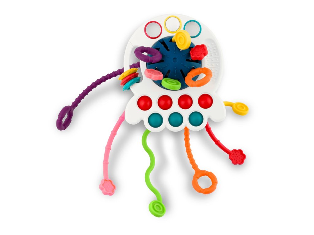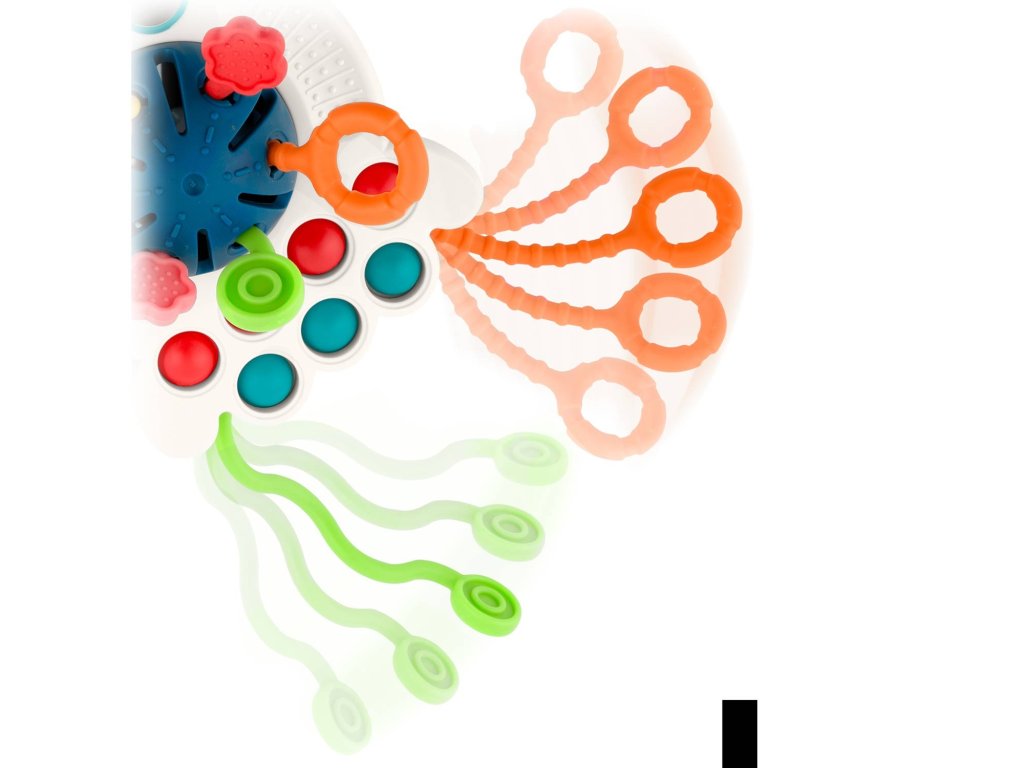 Ajáték szilikonpöttyökkelrendelkezik , amelyeket összenyomhatsz, elemeket csúsztathatsz, és minden elem színes .Ez a játék biztosan elvarázsolja gyermekedet. A fogantyúk úgy vannak kialakítva, hogy a gyermek kényelmesen és intuitív módon meg tudja fogni a játékot.