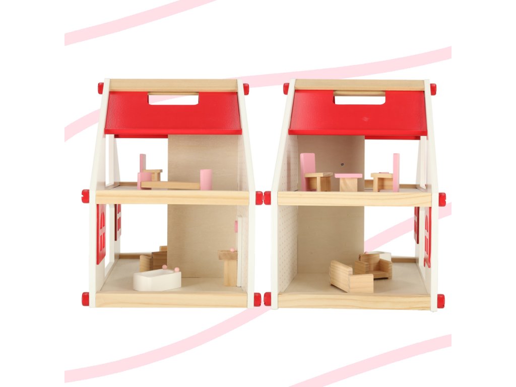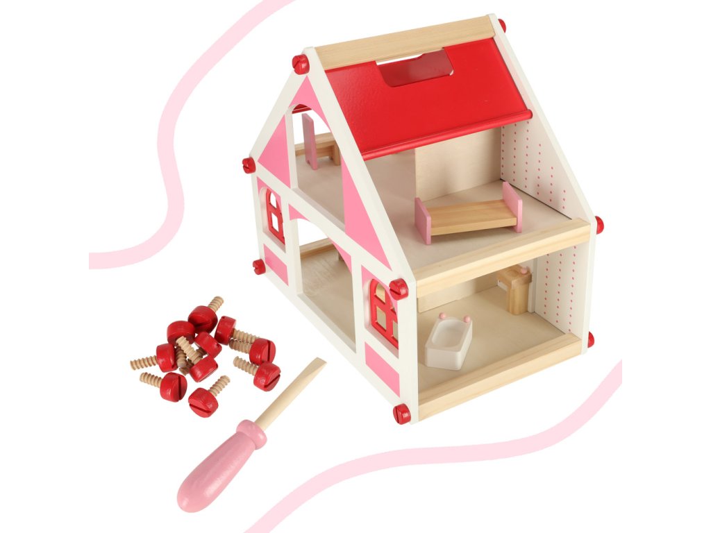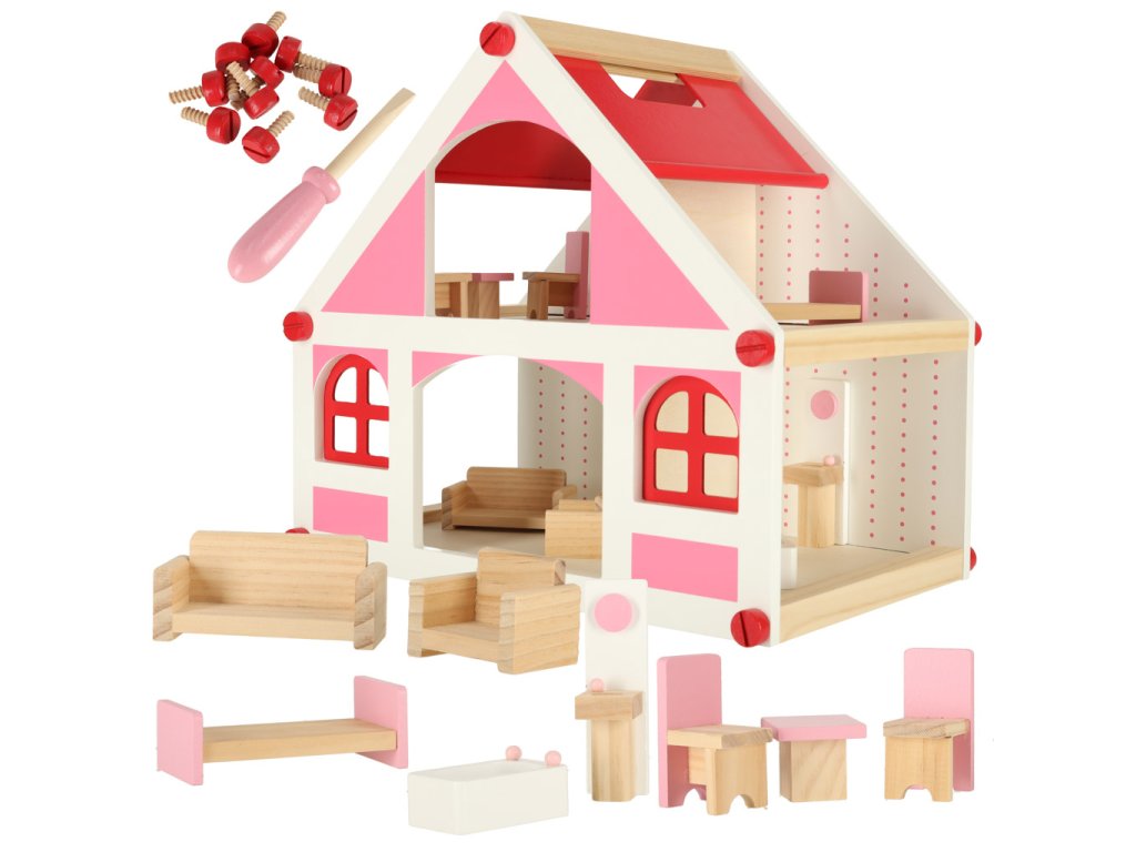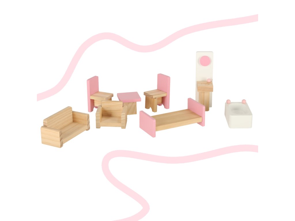 Fa babaház fehér és rózsaszín + bútor 36cm