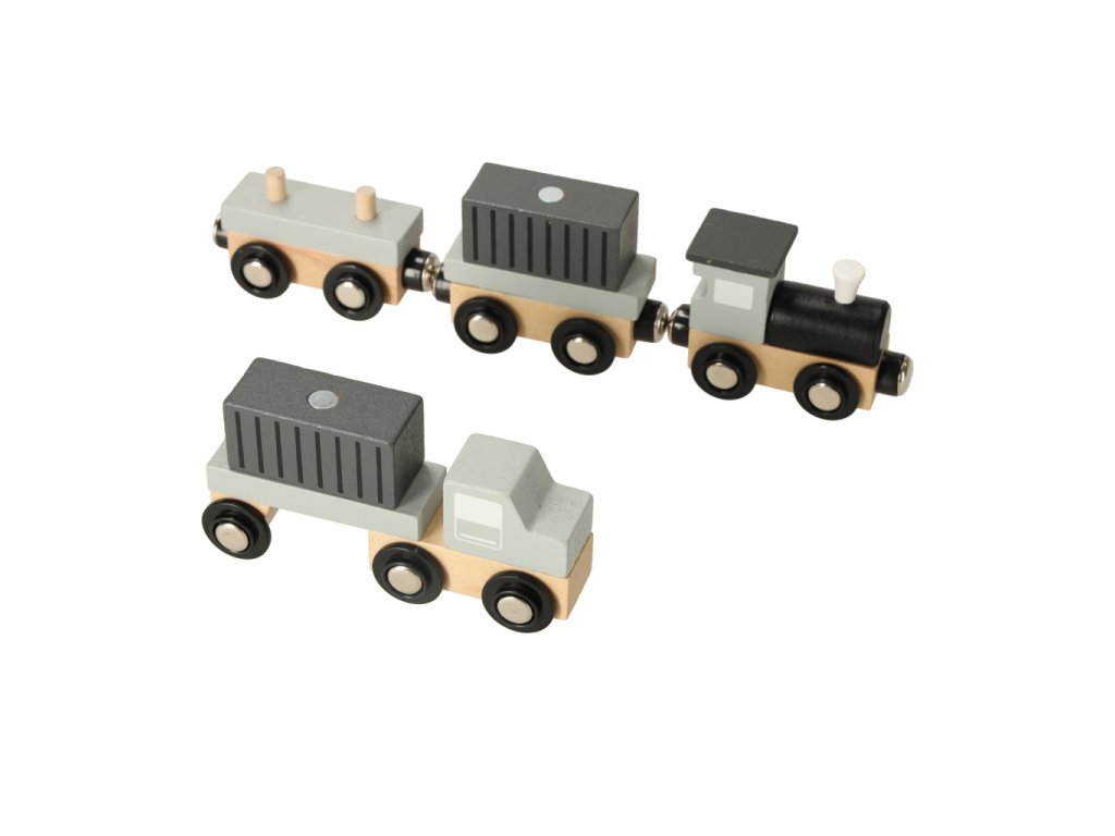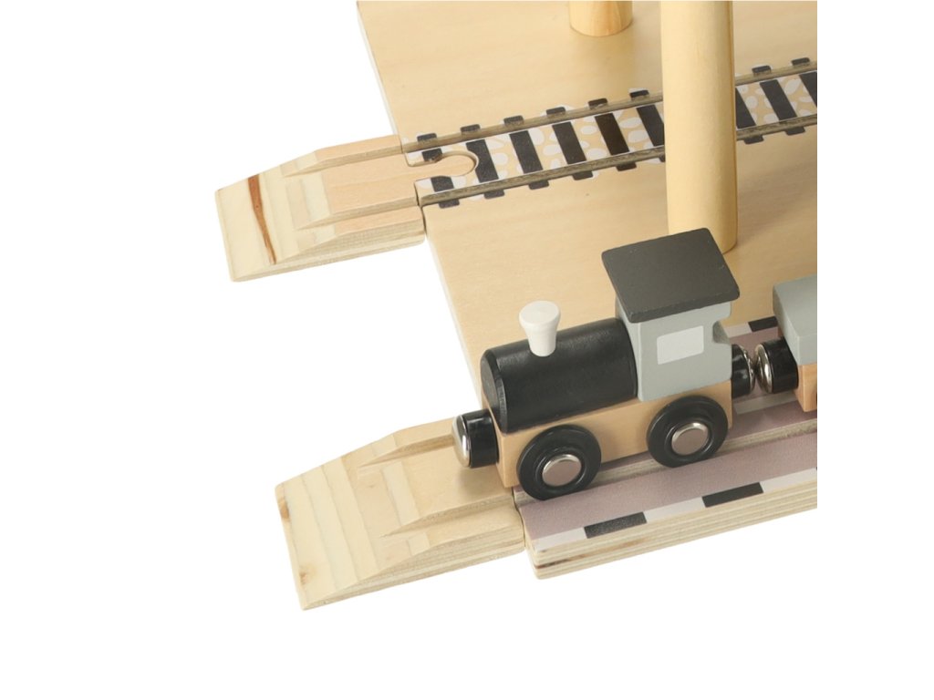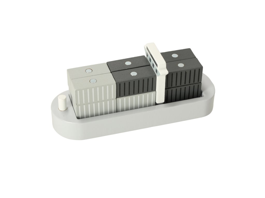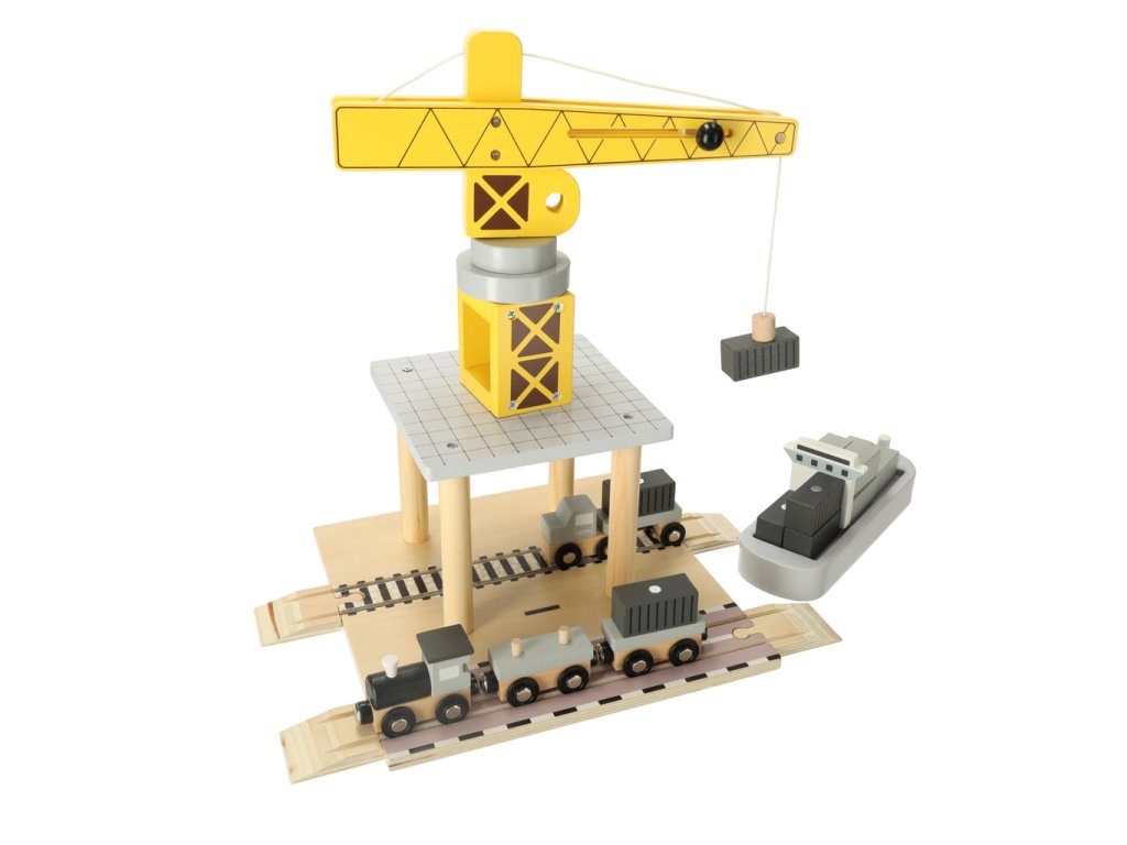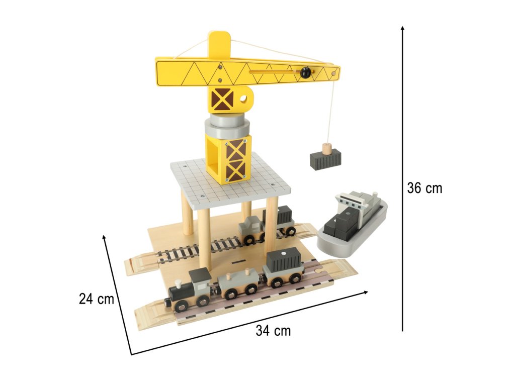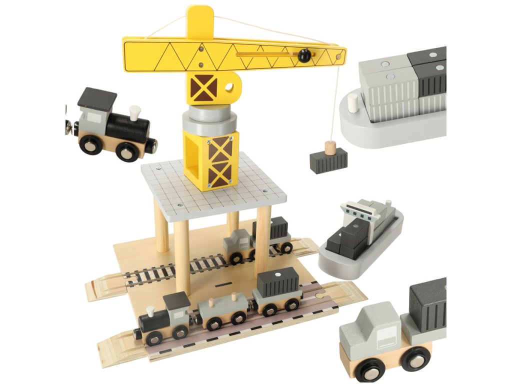 A fa tengeri kikötő daruval nagyszerű játék a kis közlekedési és építőipari rajongók számára. A készlet egy sárga kikötői daruból áll, amely forgatható, és a konténereket a hajóról a szállító járművekre – teherautóra és kettő vagonos vonatra – emelheti. Különböző alkatrészek lehetővé teszik, hogy a gyermek jeleneteket játsszon el, mint egy valódi kikötőben, fejlesztve kreativitását, kézügyességét és motoros koordinációját.