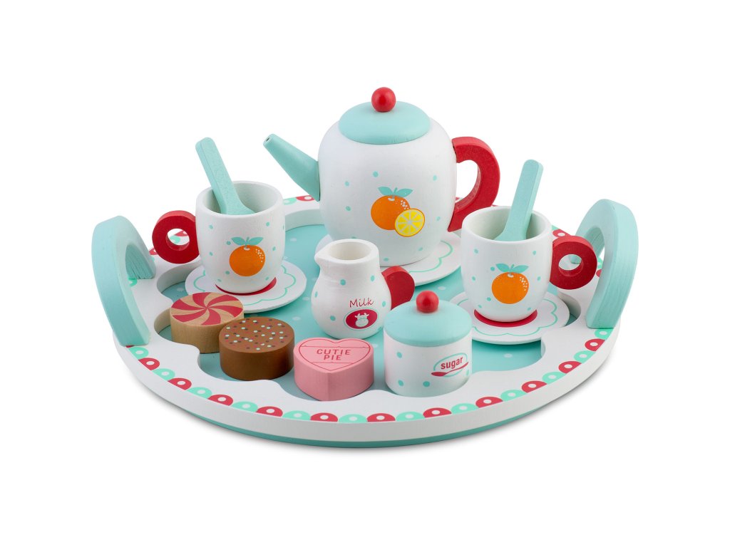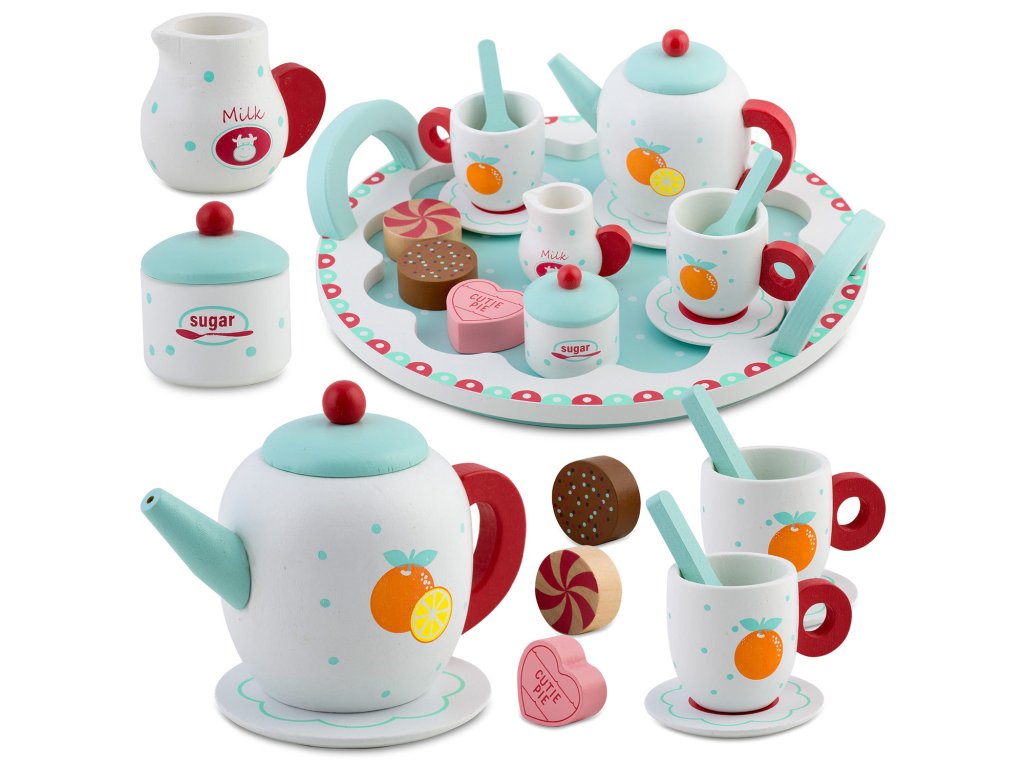 A készletben magas minőségű fa elemek találhatók, mint például kanna, csészék, kanalak vagy tálca a tálaláshoz. Ez utóbbi használható csokoládék tálalására is, ami hitelességet kölcsönöz az egész színpadnak, és lehetővé teszi a gyermek számára, hogy elegáns partikat szervezzen.
