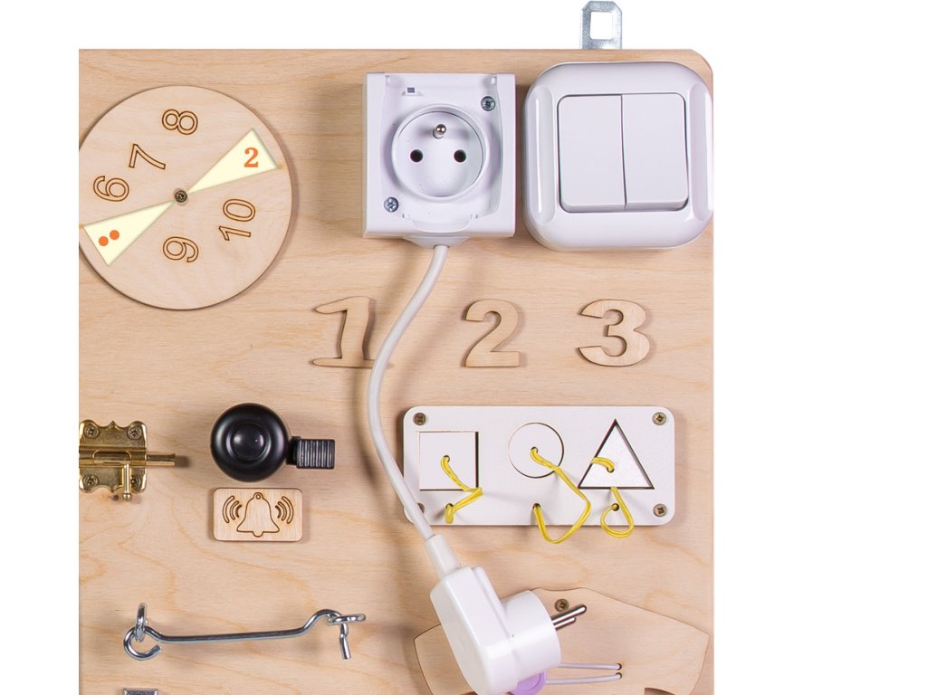 De mi is pontosan egy manipulatív tábla Ez egy termék, amelysokféle különböző összetevőt tartalmazbeleértve a konnektort, fénykapcsolót, biciklicsengőt és még sok más!