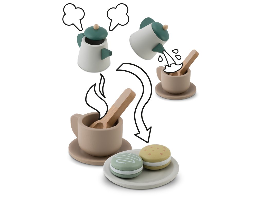 A készletben találhatók kiváló minőségű fából készült elemek, mint például kanna, csészék, kanalak vagy tálca a felszolgáláshoz. Makaronokat is lehet tálalni rajta, a csészékbe pedig mellékelt teafiltereket helyezhetünk, ami az egész jelenetnek hitelességet ad, és lehetővé teszi a gyermek számára, hogy elegáns estélyeket rendezzen.