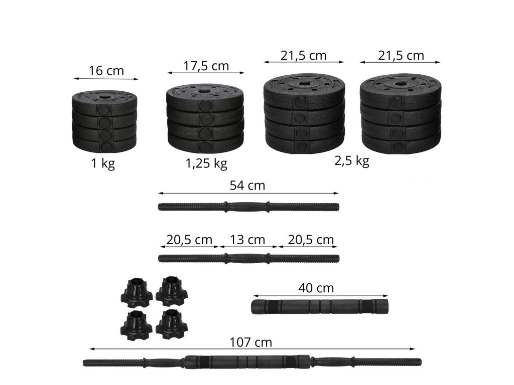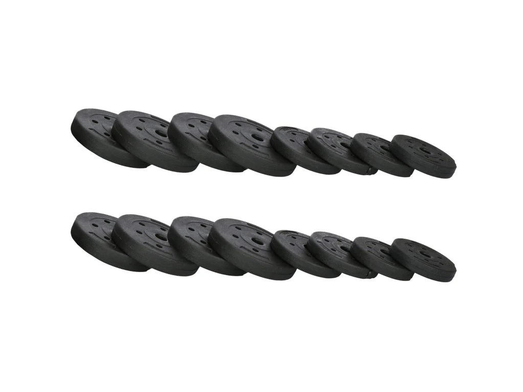 - Egyes tárcsák súlya: 8x 2,5 kg; 4x 1,25 kg; 4x 1 kg