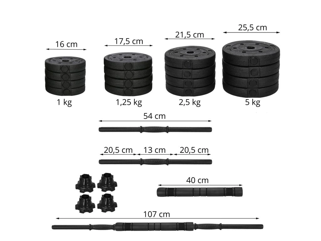 - Az egyes tárcsák súlya: 4x 5 kg; 4x 2,5 kg; 4x 1,25 kg; 4x 1 kg