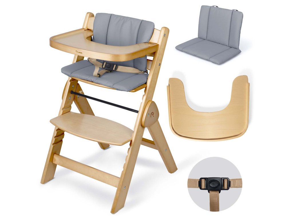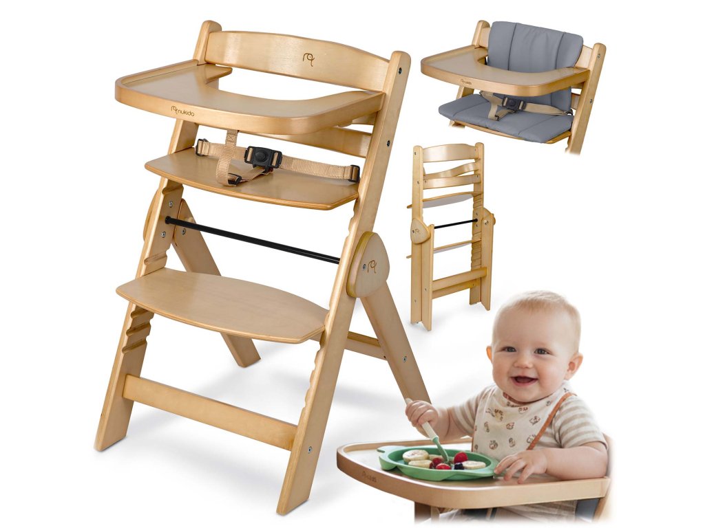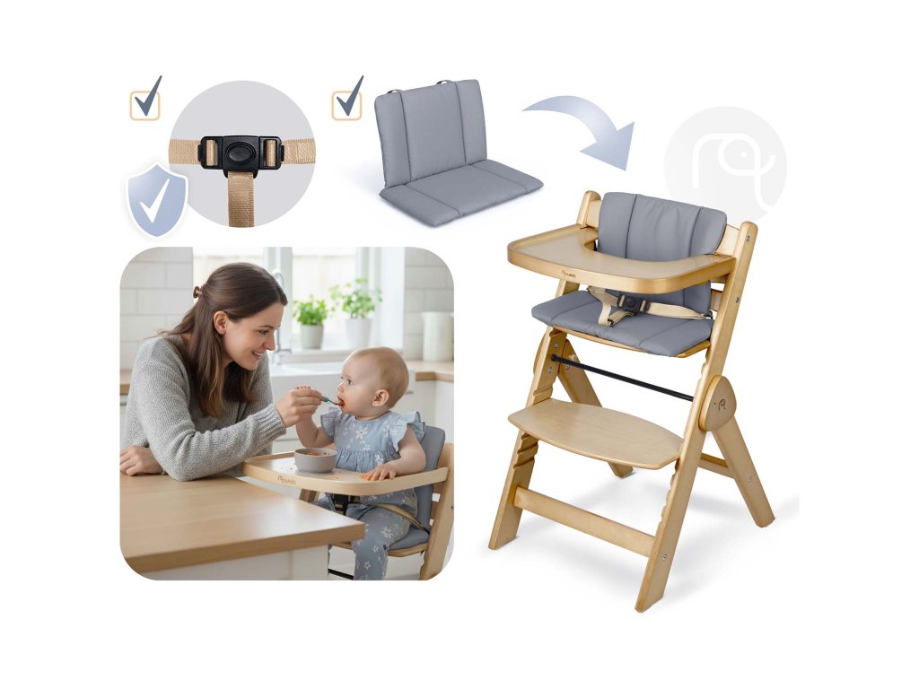 A speciális biztonsági övvel és kényelmes párnával ellátott készlet biztonságos és kényelmes első etetőszékké válik a kisbabád számára. Ideális az első étkezésekhez és a családi pillanatokhoz az asztalnál.