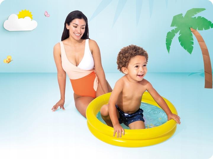 A mini medence PVC-ből készült, sárga színű, állatfigurás grafikával az alján.