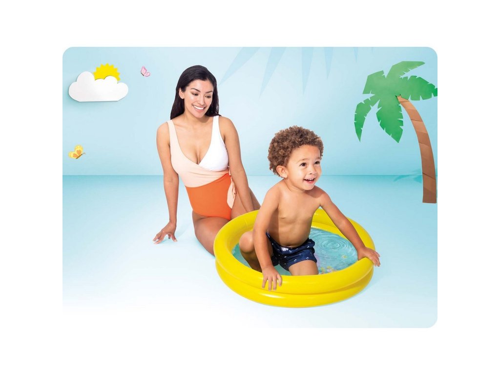 A mini medence PVC-ből készült, sárga színű, állatfigurás grafikával az alján.