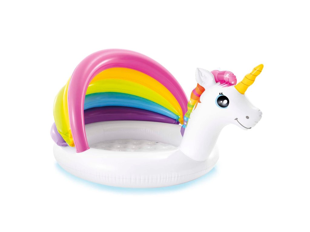 Felfújható medence gyermekeknek Puha felületű egyszarvú beépített tetővel ideális hely a szórakozáshoz a nyári hőségben.